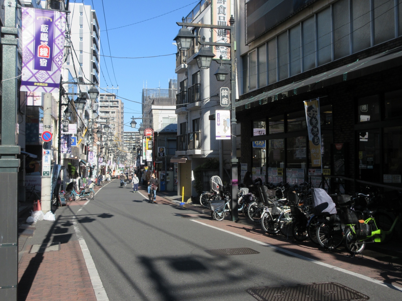 江戸時代に整備された五街道の一つである中山道の最初の宿場・板橋宿に造られている人通りが多く、活気が感じられる商店街です。道沿いにはスーパーや飲食店、弁当屋、和菓子屋、昔ながらの米屋、定食屋などが軒を連ねています。周辺には室町時代に創建された寺や、江戸時代の宿場跡であることがわかる小さな碑などが建っていますが、宿場を感じさせる建物はほとんどなく、宿場らしさが感じられないのが残念です。