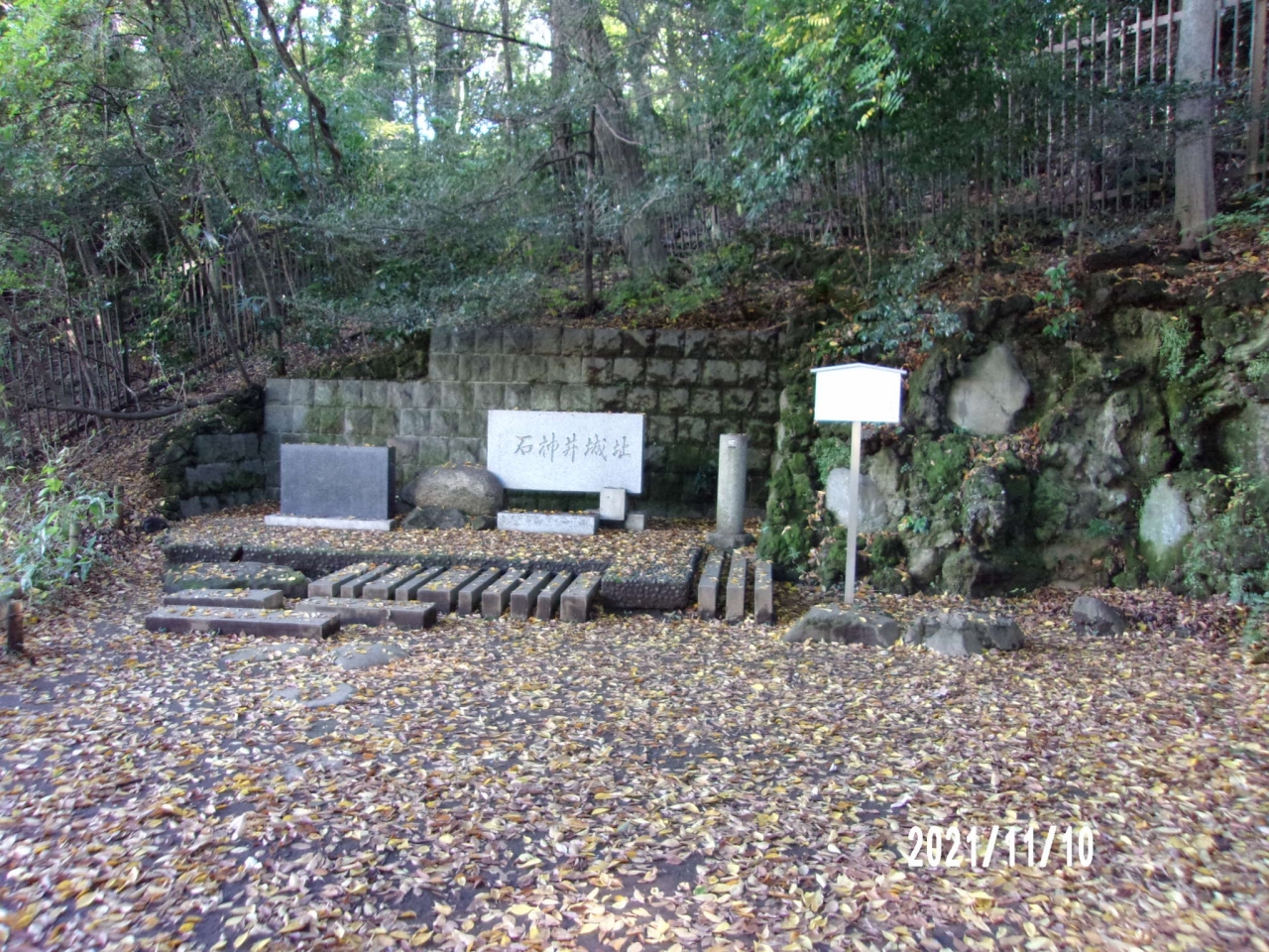 この石神井城址碑は西武池袋線石神井公園駅から西南に15分程度にある都立石神井公園の中でも西側のエリアにあります。三宝池の南から石神井城址本丸跡に上る階段のもとにあります。古い石とあたらいい石碑があります。この碑があるところは見逃してしまいそうです。