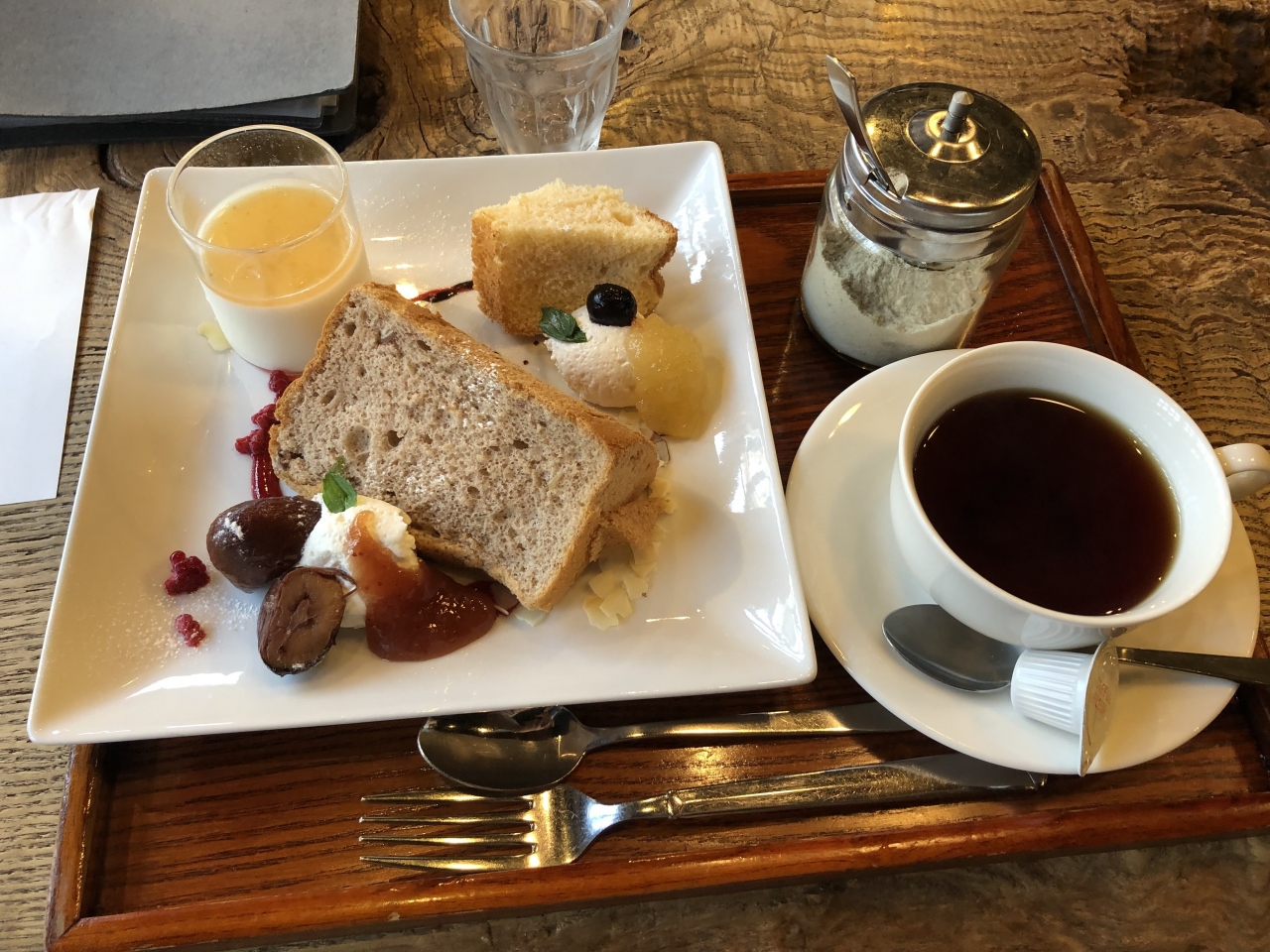 本町通にある古民家カフェです。いつも行列ができているときいていましたが、夕方の時間帯で並ばずに入ることができました。期間限定で栗のパフェがメニューにありましたが、夕食が控えていたので日替わりケーキセット大を頼みました。シフォンケーキとパンナコッタ+好きなケーキひとつと飲み物のセットですが、ケーキやパンナコッタは小さいサイズなのであまりお腹にも、もたれません。
