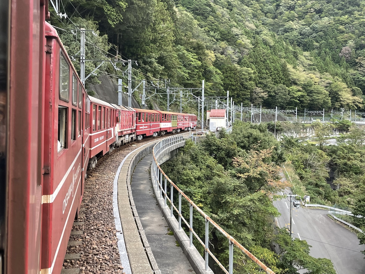 乗車した平日は学生団体もあり2編成、重連の8両編成でした。紅葉にはまだ早かったですが、さわやかな秋晴れの中、汽車旅が楽しめました。線内のハイライトのアプト区間は、90パーミルの急勾配の登りをはっきり実感できました。