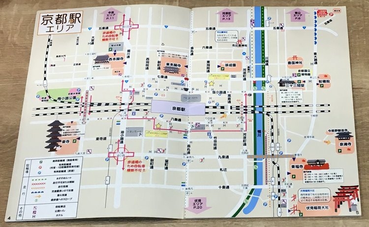 東九条室町の営業所を利用しました。京都にはいくつかレンタサイクルがありますが、エコトリップは初めての利用で「次回も」と思わせる見事なサービス内容で、京都という街の観光レベルの高さを思い知りました。早朝から夕方まで1日プランでしたが、最初は価格が高いと思いました。でも添付された観光マップが詳細で、もうこれだけで有償にしてもよいだけの価値があると思いました。それぞれの名所ごとの駐輪場の有無、その位置や課金システム、さらには線路や橋を横切るときの交通量や一方通行などもう至れり尽くせり。伏見稲荷、東福寺、東寺、二条城、三条通り、木屋町通り、建仁寺、八坂神社とかなりハードに回りましたが、アップダウンも少なく電動のバッテリーは余裕がありました。次回はこの地図を再び予習した上で持参したいほどの代物でした。