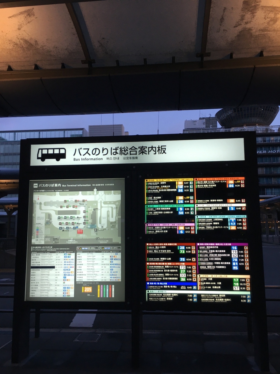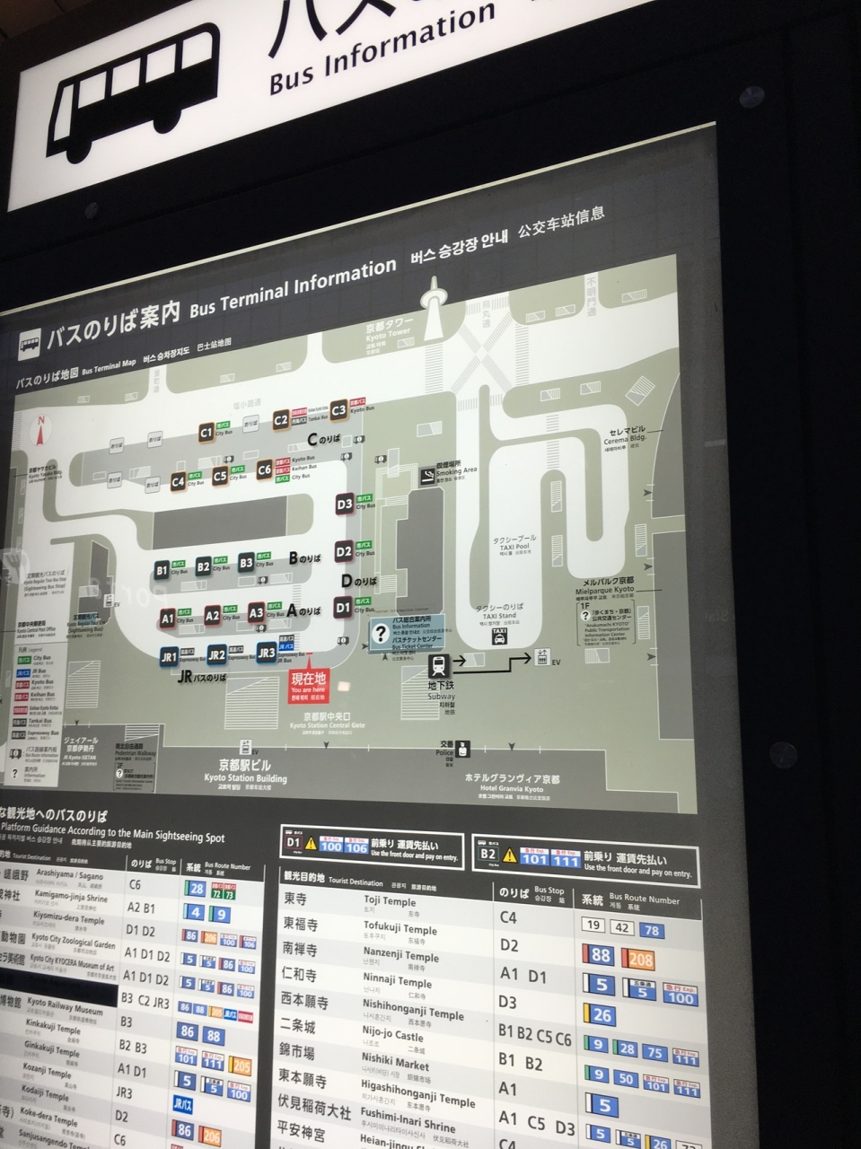 京都駅役烏丸口出口を出て目の前にあり、直ぐにわかります。各方面の案内看板も出ていて初めて訪れる人にもわかりやすいです。横にはバス案内所もあって便利。1日乗車券等もありお得感もあります。バスは普通の良く見かけるバスです。