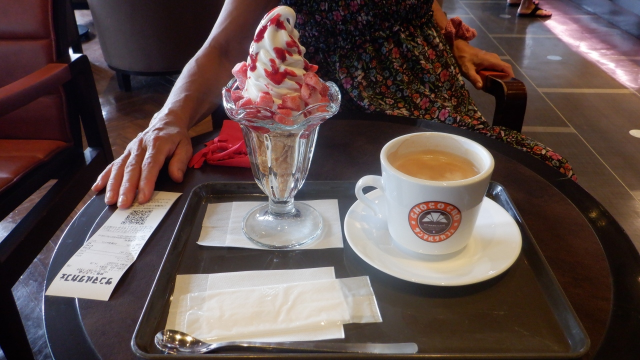 姫路駅前の喫茶店を探しました。 駅前のカフェを何件か見てモンロワールさんに入りました。お店は繁盛してました。イチゴパフェとコーヒーで一服しました。