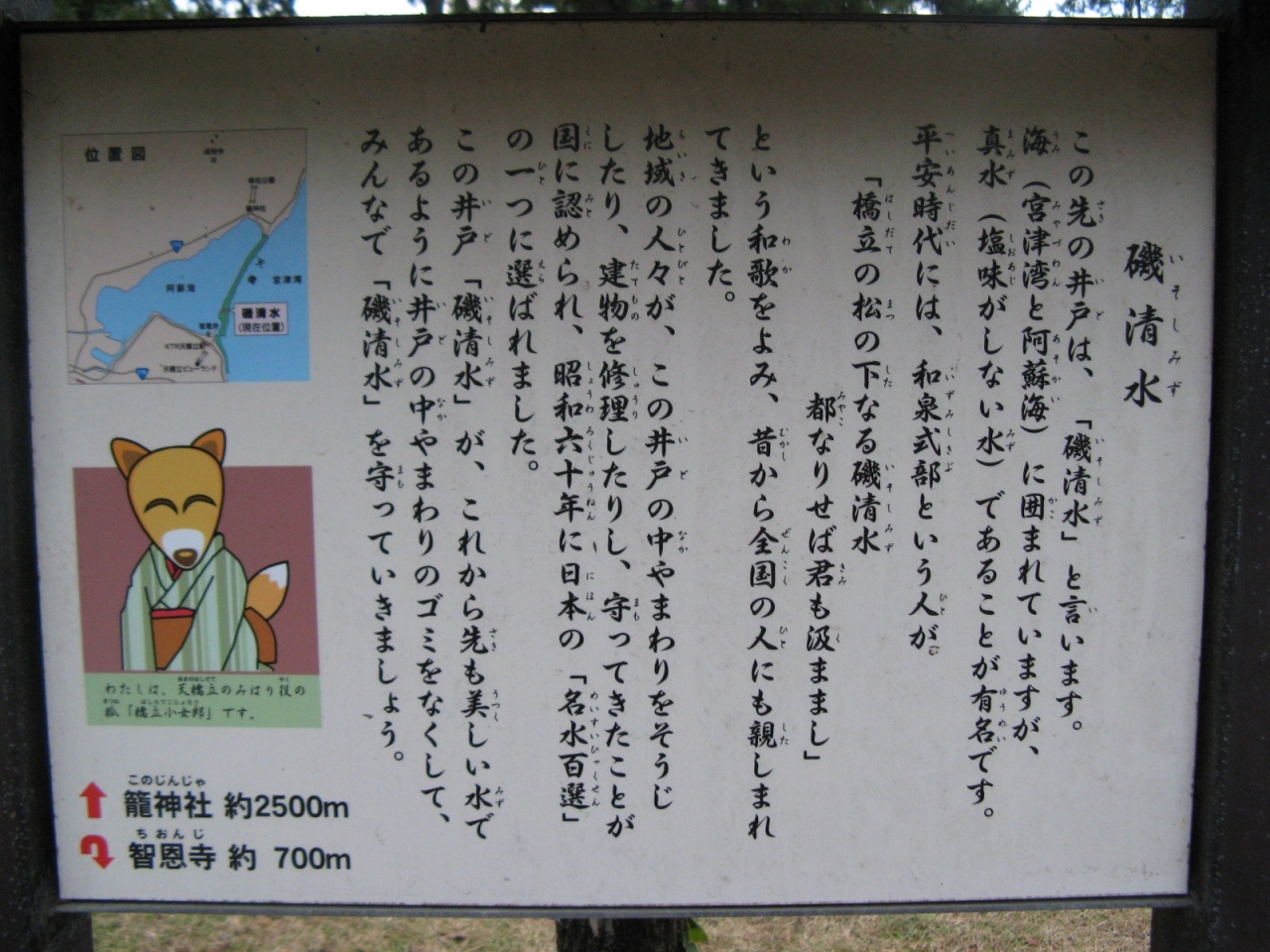 天橋立の文殊エリアから数百メートル行ったところにあります。周りを海に囲まれているのに真水が湧き出ている不思議な場所で名水百選にも選定されています。湧水なので飲用は不可の表示があったので飲みませんでしたが、隣に天橋立神社があるのでお参りする時は手水として使ってみるのが良いです。