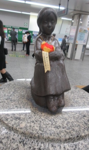 有名な赤い靴の像は山下公園にありますが、この像は山下公園ではなく、横浜駅にあります。場所はJRの改札を出たあたり、連絡自由通路にあるので待ち合わせスポットとして利用されています。像自体は小さいのですが、像の周辺が少し整備されています。横浜らしいスポットではあります。ちなみに今回行ったときは首から何か下げていました。