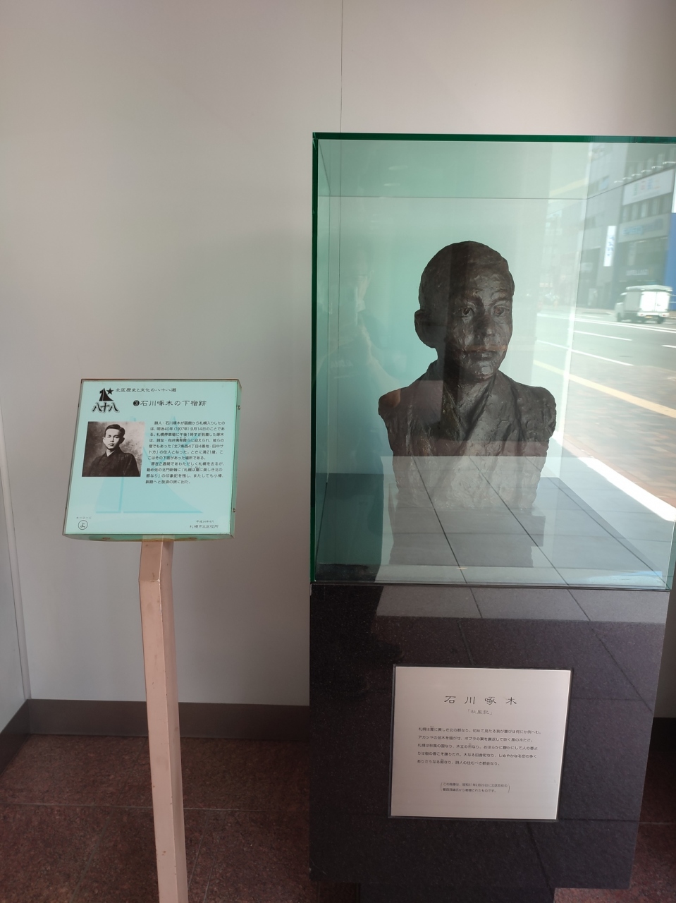 札幌駅北口からほど近いところに札幌クレストビルというビルがあり、そのビルの敷地に入って右手にあります。外からは見にくい場所です。頭部の銅像と簡単な説明があります。あくまで下宿先があったというだけで、そんなに興味深い場所でもないです。
