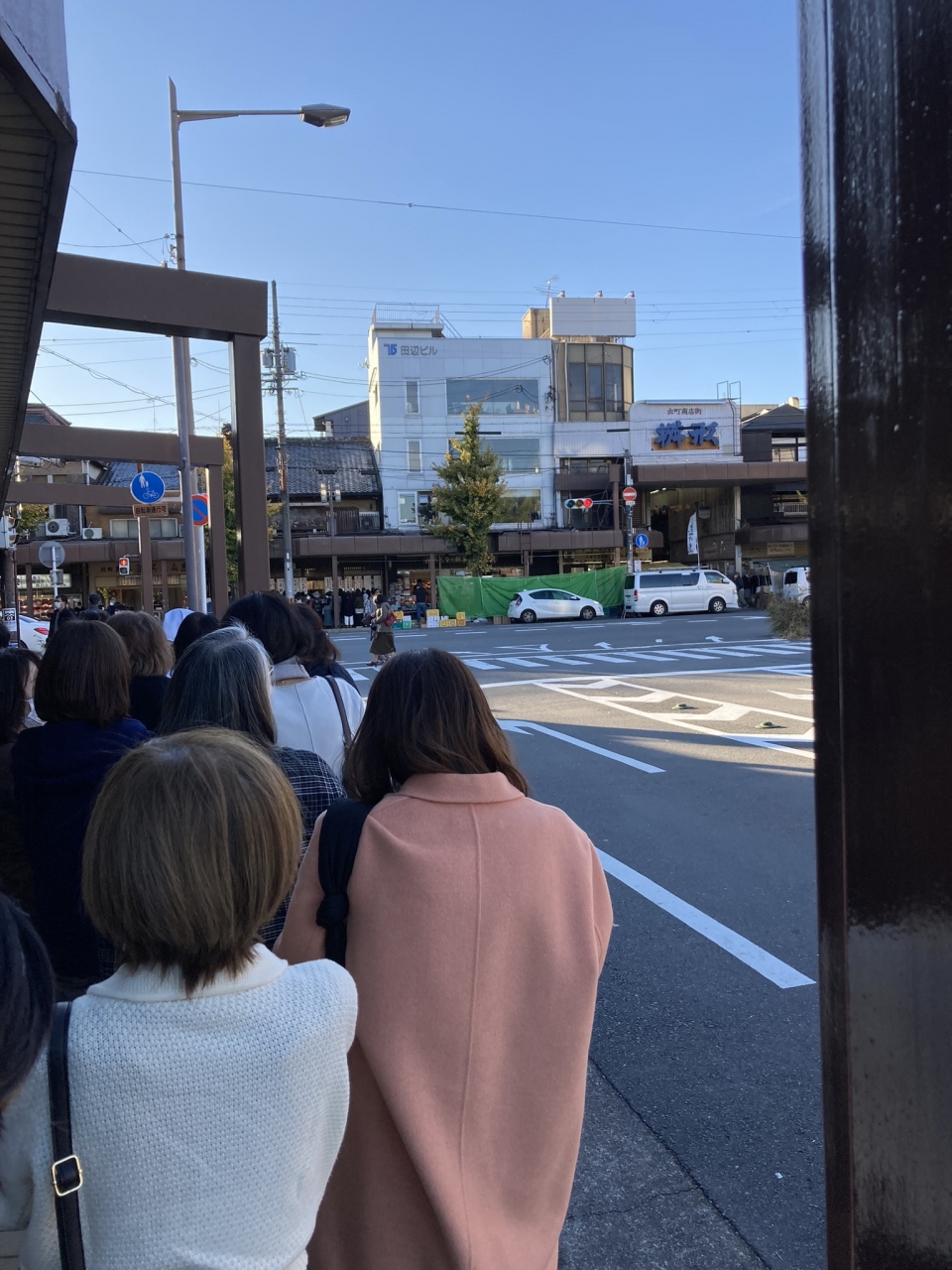 出町ふたばの豆餅を食べてみたくて、平日の午後4前頃にお店に行きました。店頭にすんごい人が…と思ったら甘かった!道路を隔てた向こう側が最後尾とのこと。せっかく来たのでそちらの列の最後尾に並びました。