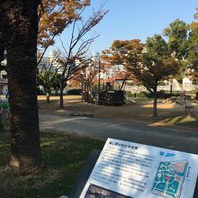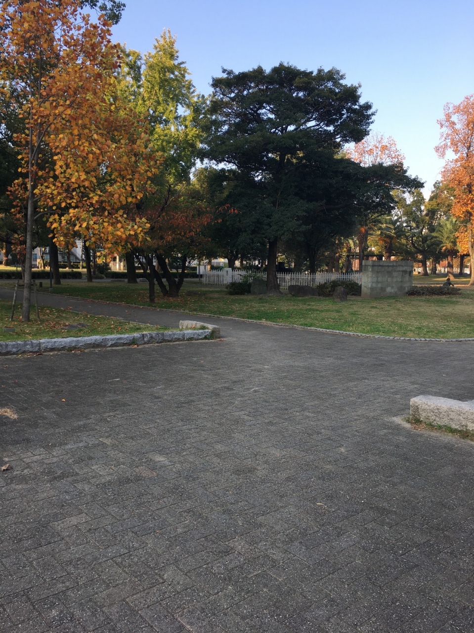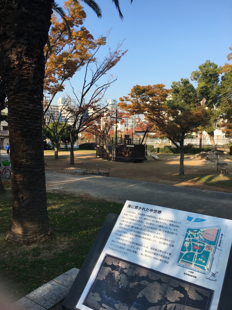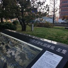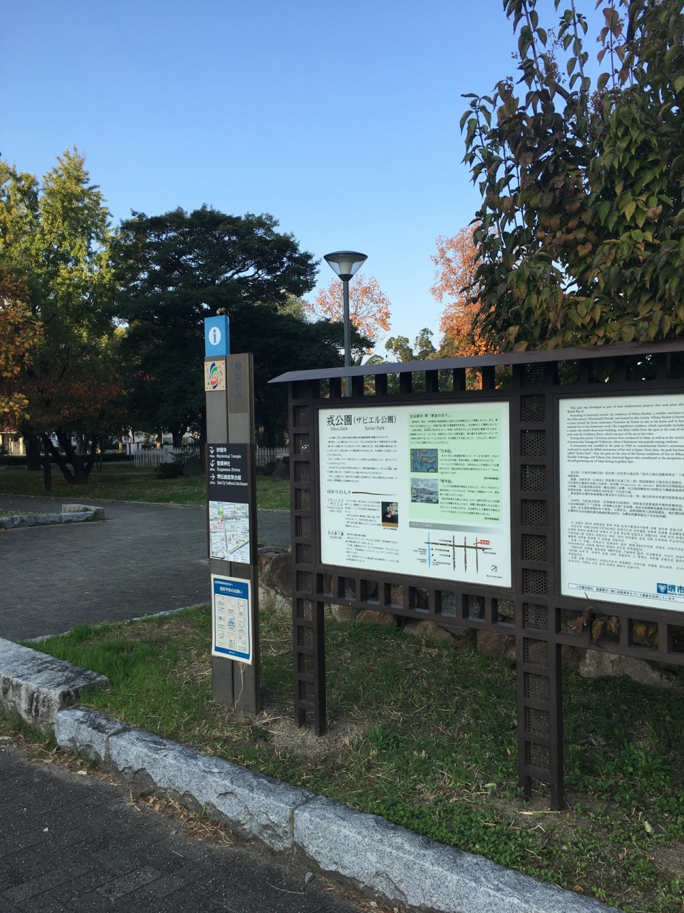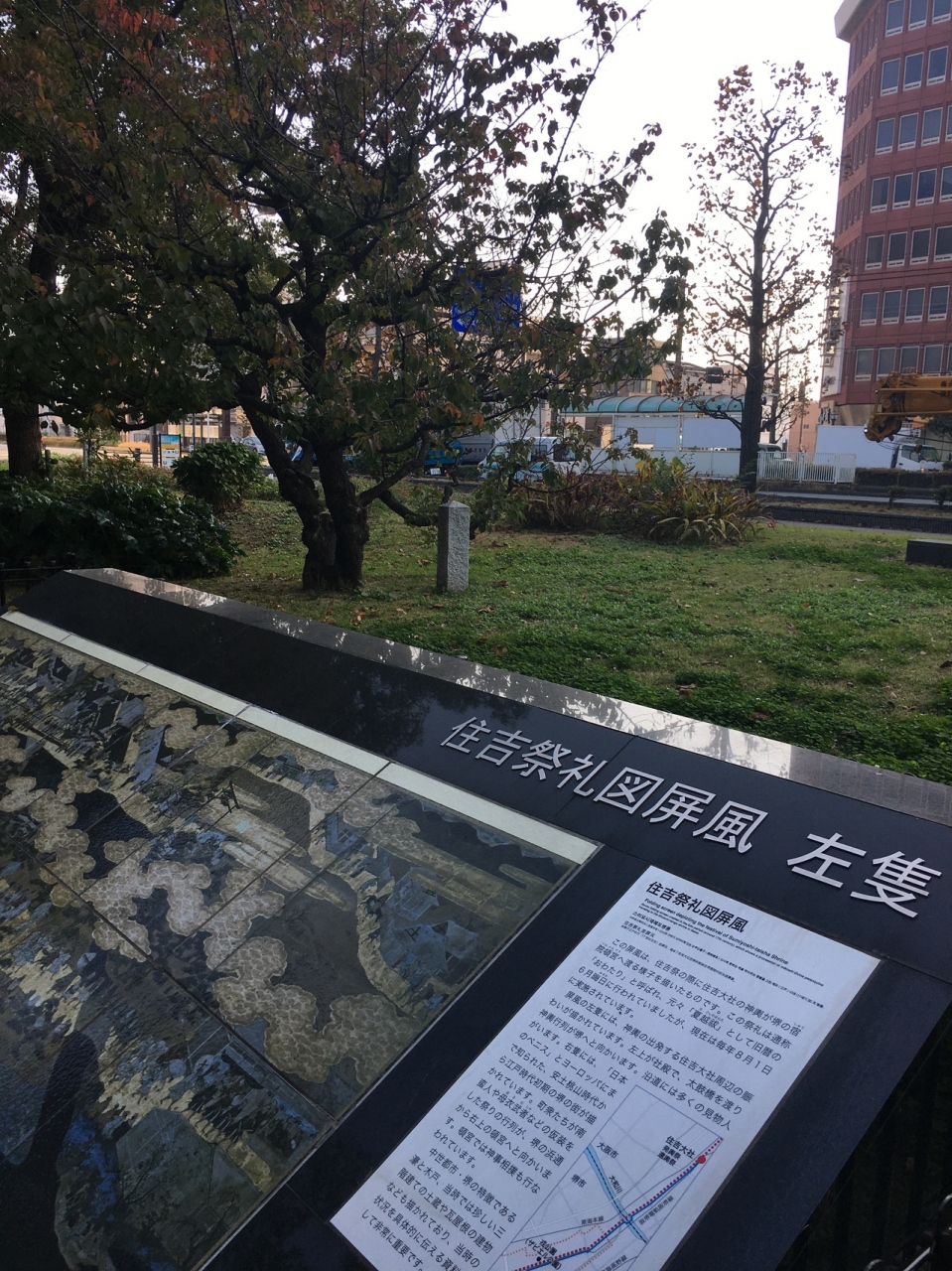 幹線道路沿いにある広い公園でした。住吉祭礼屏風が2つあり江戸時代の堺の街並みが描かれていました。少し歩くと東と西の接点の黒い変わった碑がありました。大きな公園で木々が立ち、犬の散歩をしている人が幾人かいました。