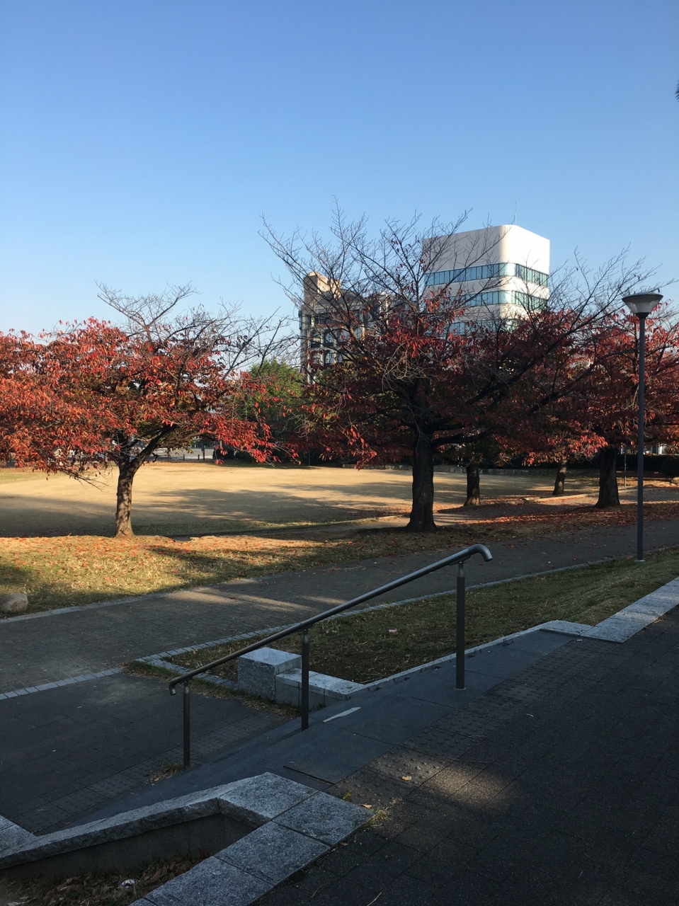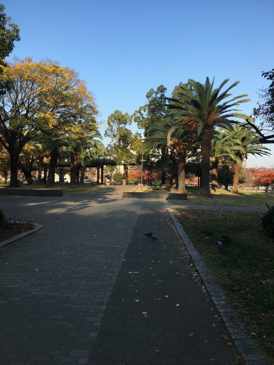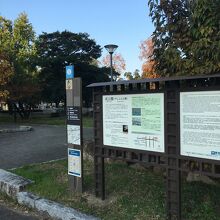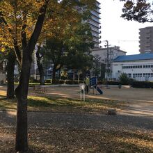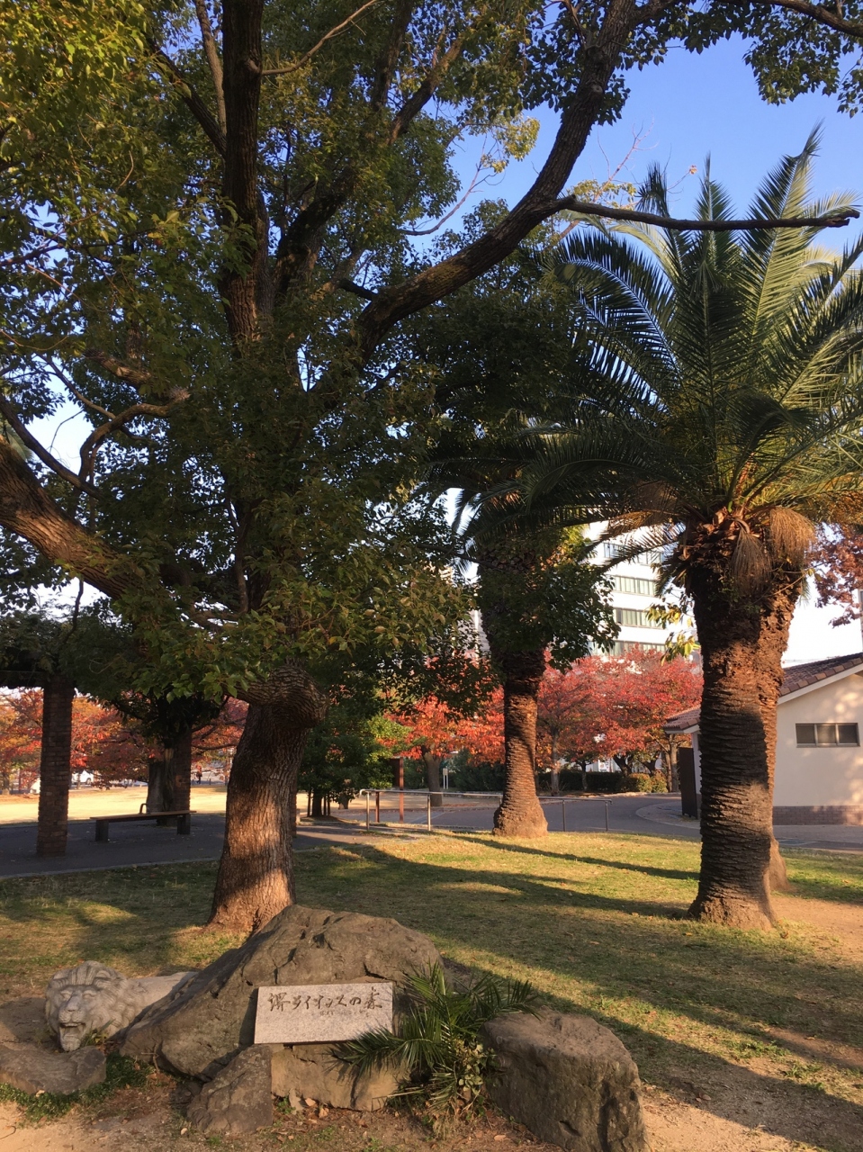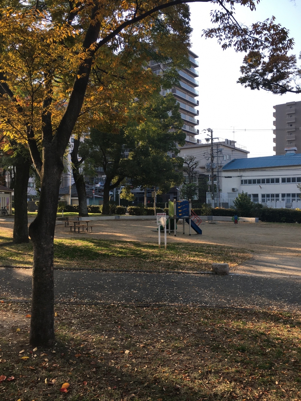 幹線道路沿いにある広い公園でした。住吉祭礼屏風が2つあり江戸時代の堺の街並みが描かれていました。少し歩くと東と西の接点の黒い変わった碑がありました。大きな公園で木々が立ち、犬の散歩をしている人が幾人かいました。