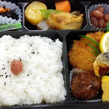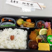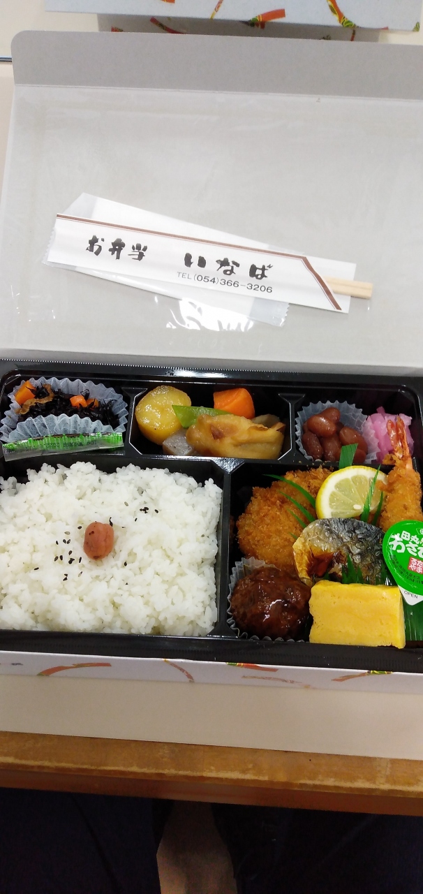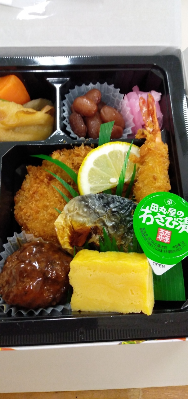 焼き魚・煮物等々和食中心のおかずです。ヒレカツとエビフライもあって満腹仕様の構成でした。田丸屋さんのわさび漬けミニカップも静岡のお弁当マストアイテムとして入ってます。味付けは抑えめの飽きずに食べきれるお品でした。