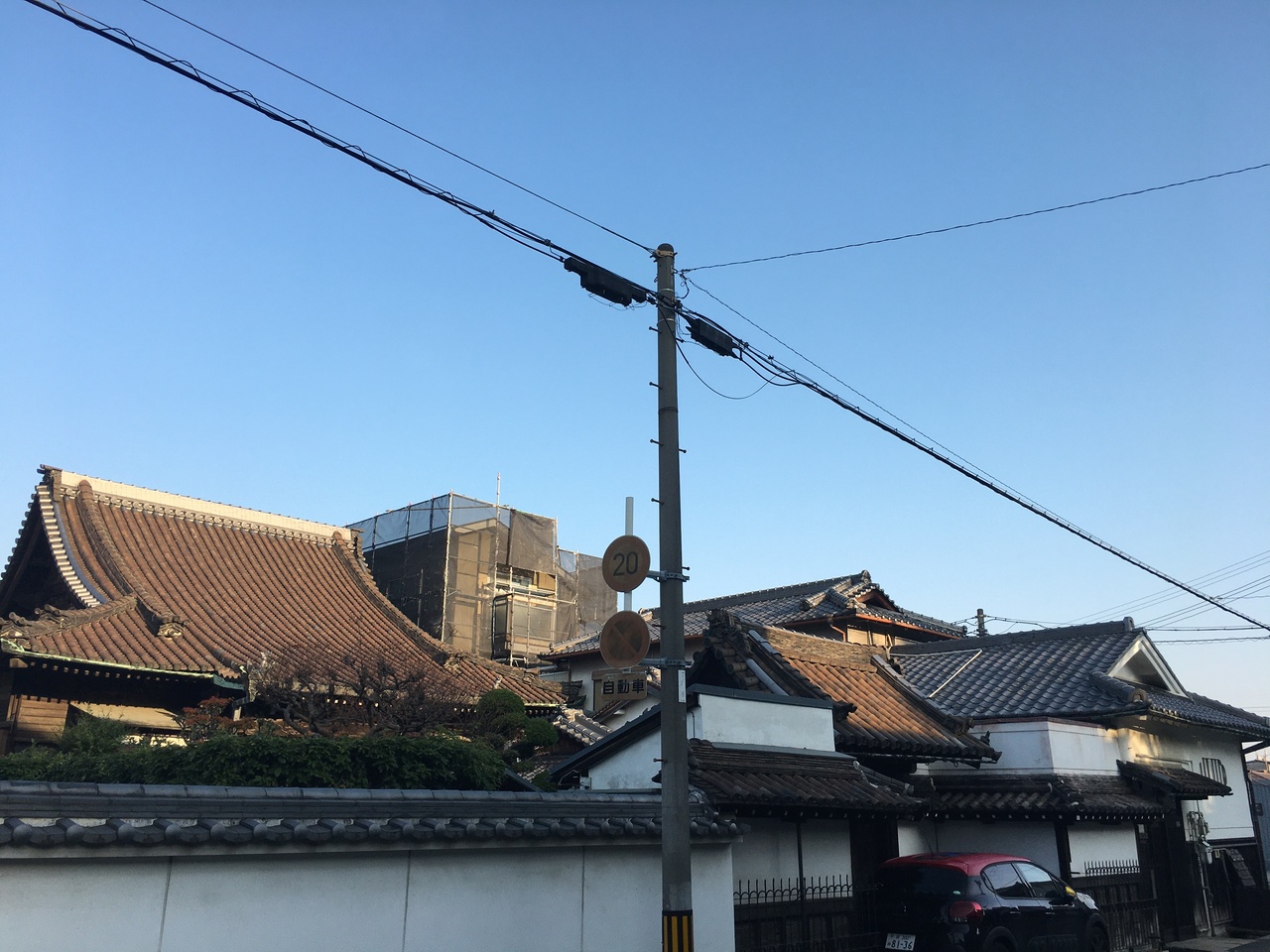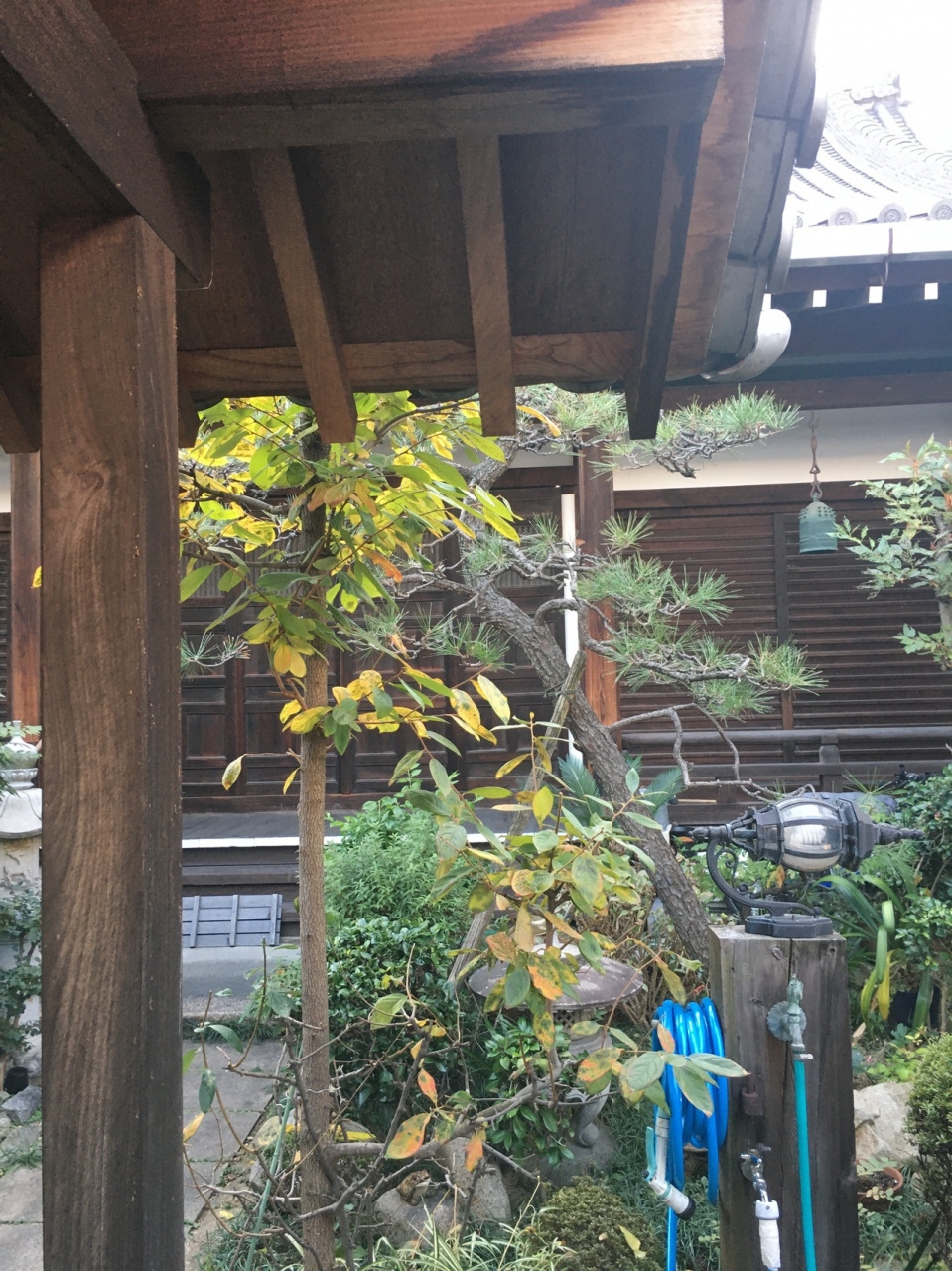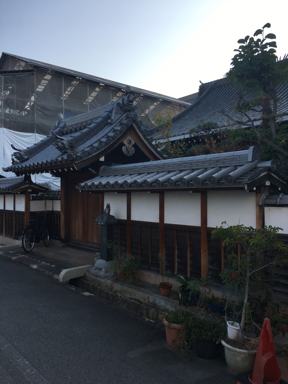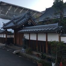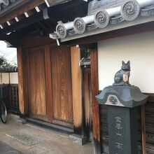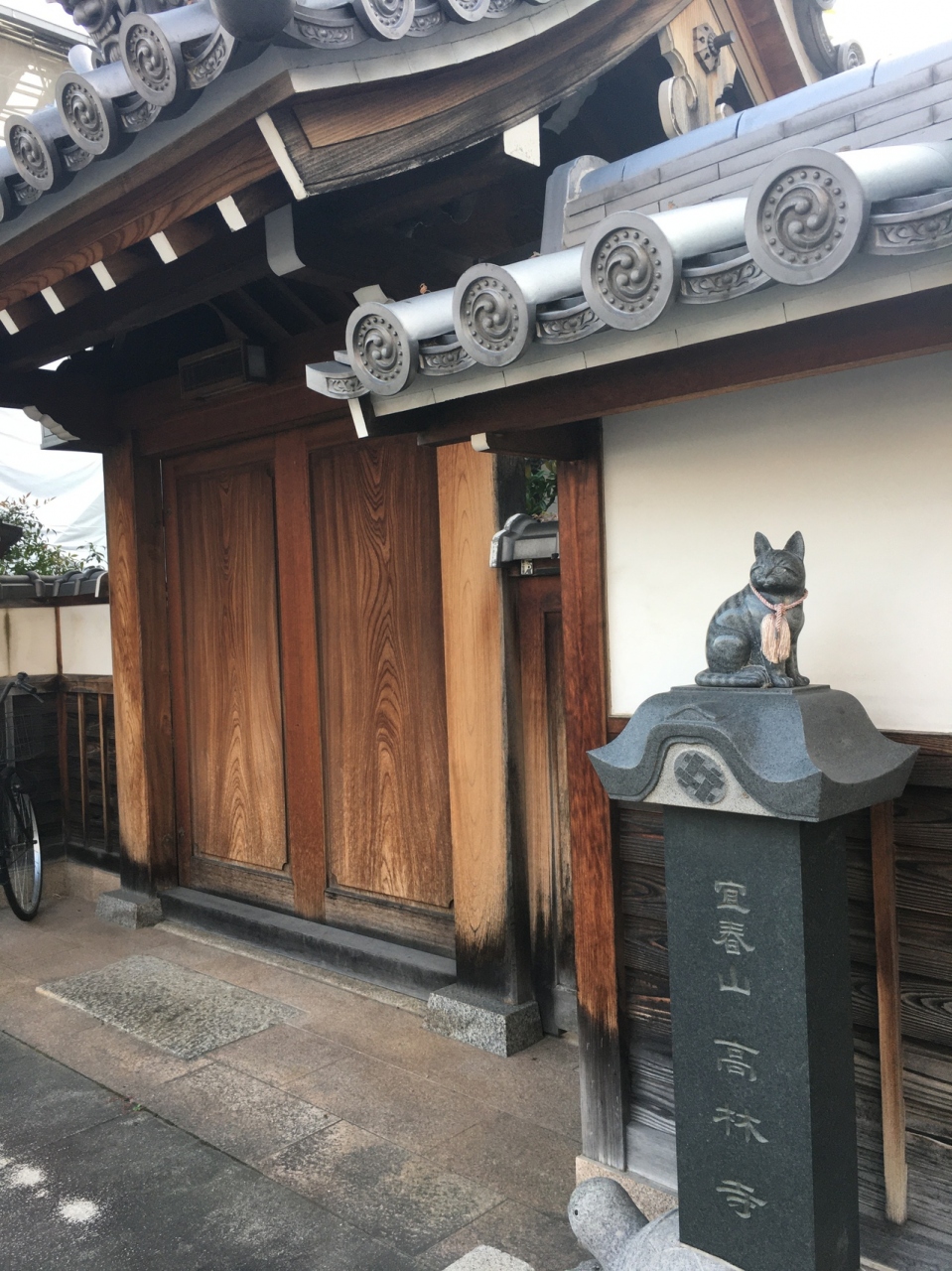 寺が並んでいるエリアにある小さな寺。瓦屋根の小さな門の左右は白い壁で上部は瓦屋根でした。門を潜ると直ぐに本堂で周りには草木がありました。門は木の扉で、横には小さな黒い猫の像がありましたが観光寺院ではないので静かな場所でした。