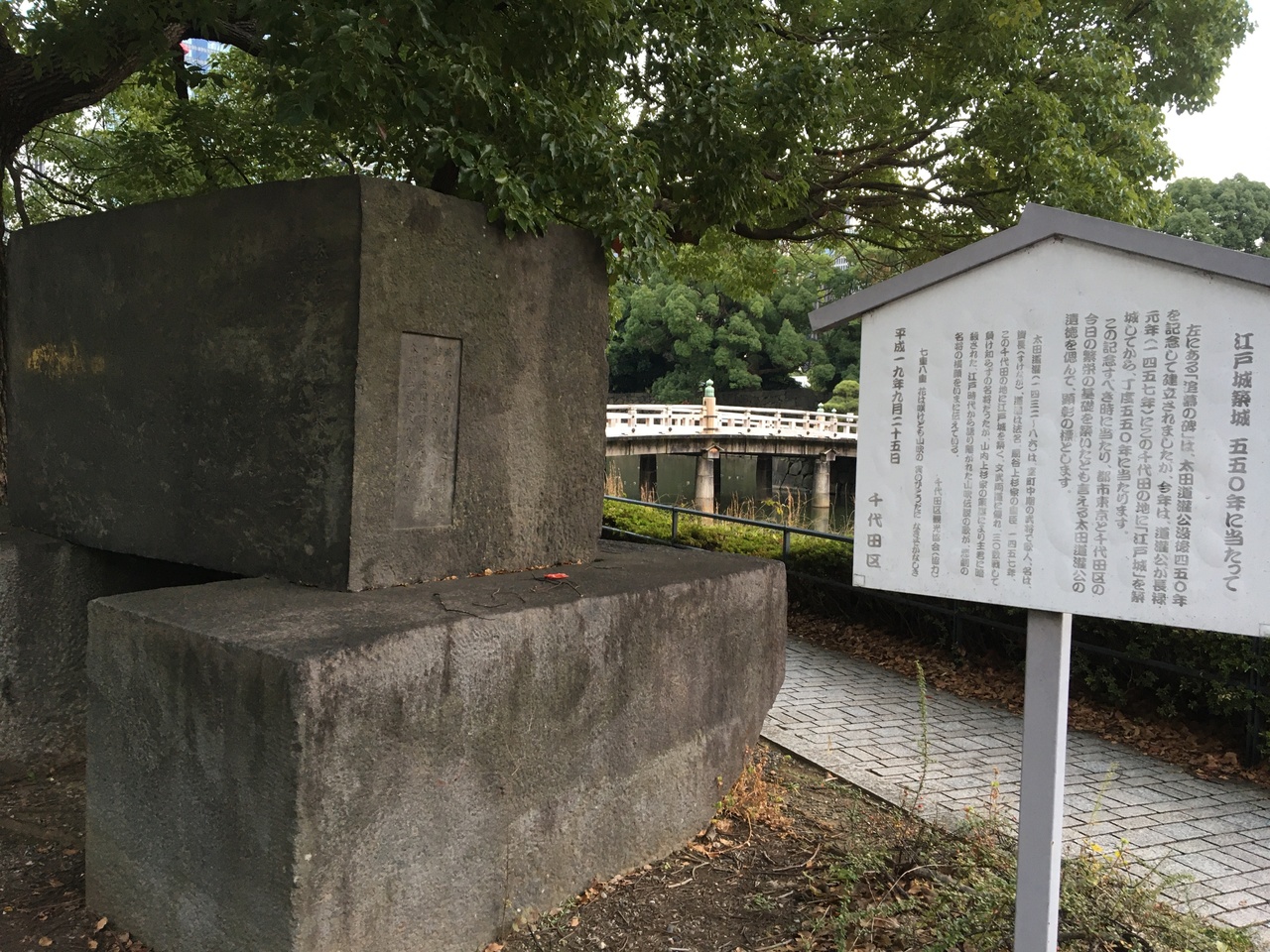 皇居の周りを徒歩で散歩中、平川橋のすぐ近くに大きな石碑を見つけました。近寄ってみると、太田道灌に関わるものとのこと。最近、川越を訪れる機会があり、川越市役所の前でも太田道灌の銅像を見ました。太田道灌は、室町時代後期に関東で活躍した武将で、江戸城の築城にもかかわった人物。江戸というと徳川家康が思い浮かびますが、その前に地盤を築いた人物がいたとは、歴史は奥が深いです。