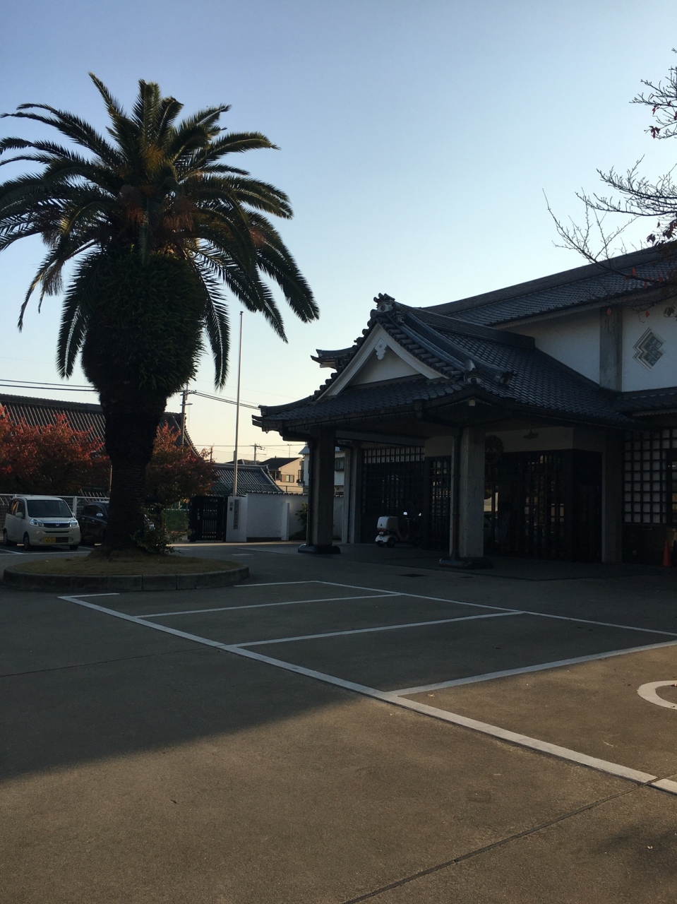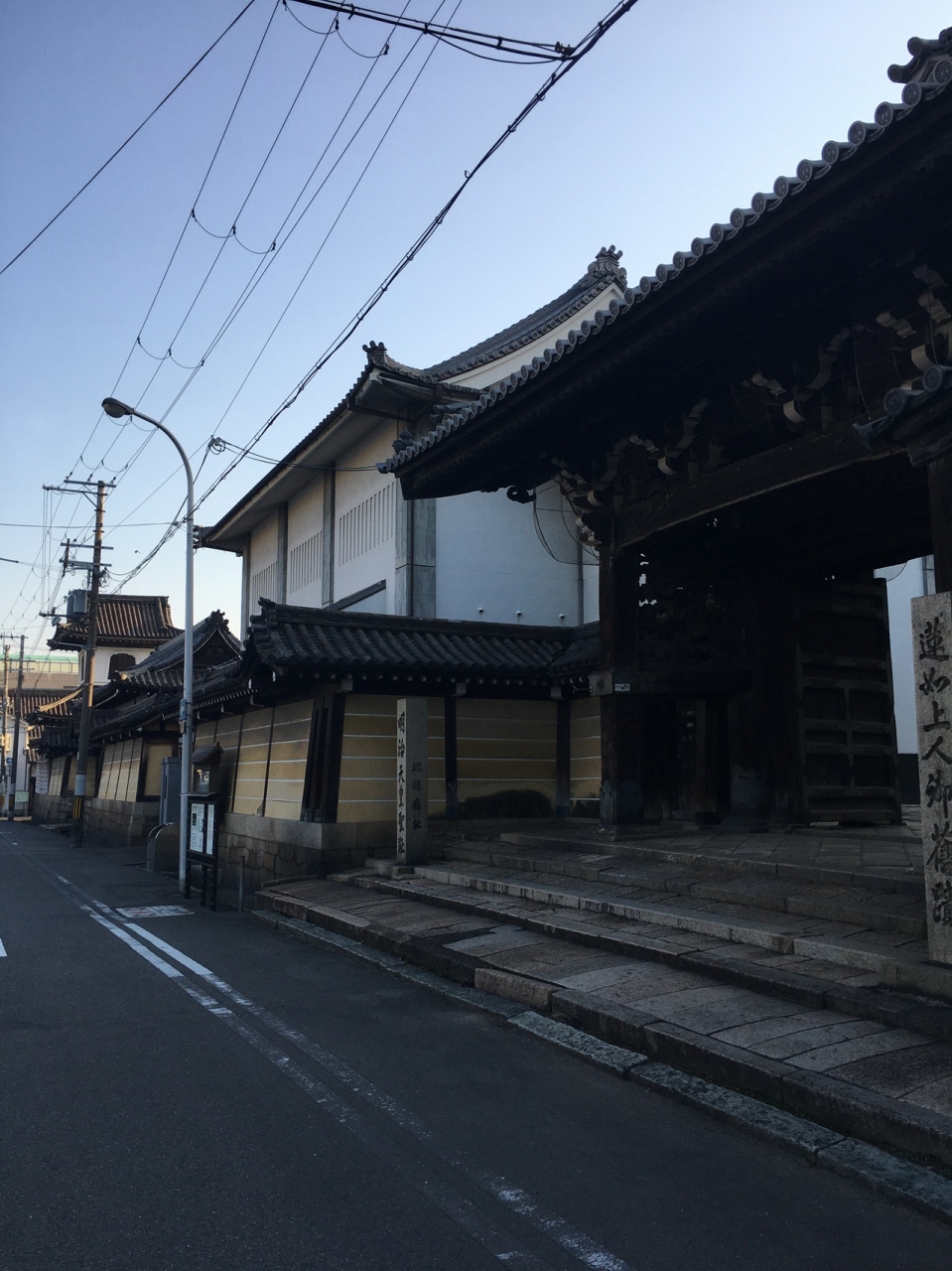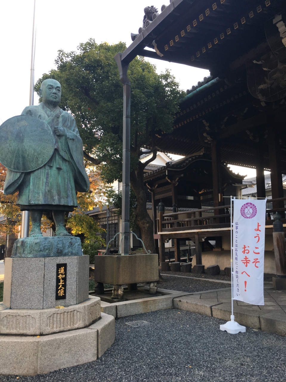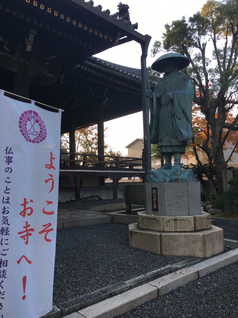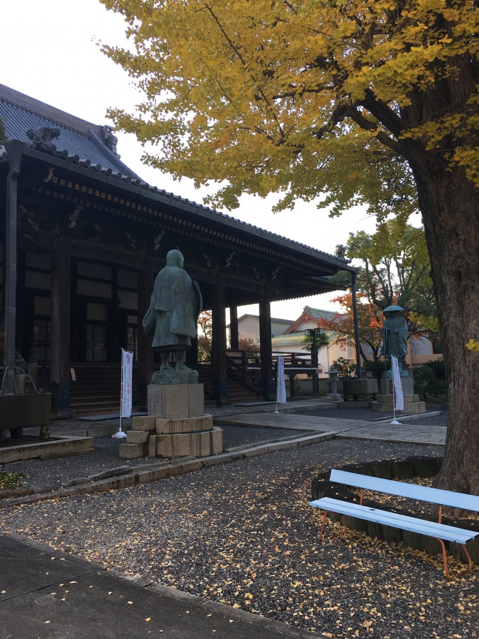 門も大きく、本堂も大きく広い敷地でした。大きな椰子の木ががあって南国ぽく、親鸞と蓮如上人像が向かい合っていました。周辺にはたくさん寺があってこじんまりしていましたが、その中でも一番大きな寺でした。銀杏の木の落ち葉が哀愁感漂っていました。