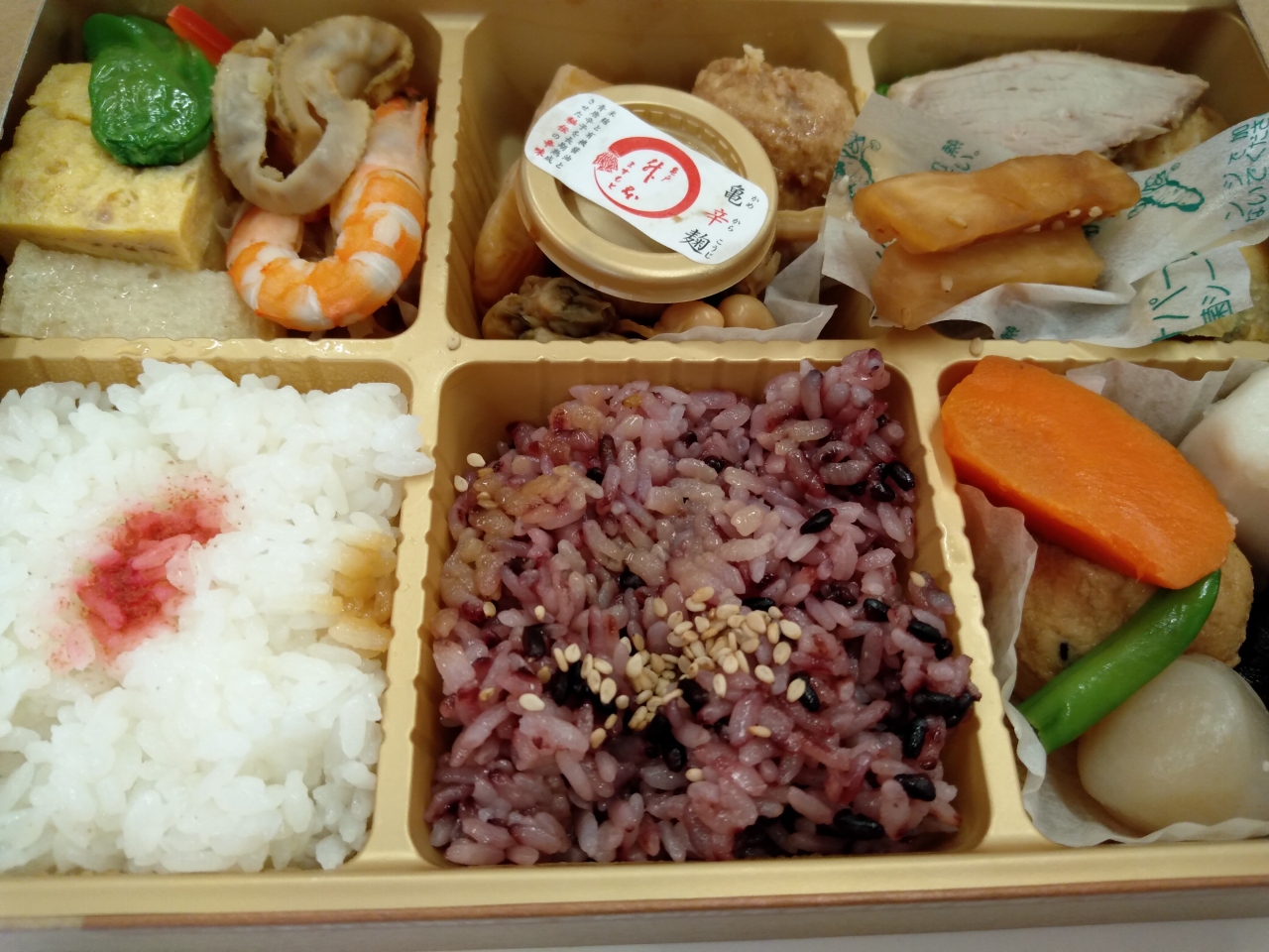 亀戸にある升本のお弁当。デパ地下に出店しているので、亀戸にはいったことないけど、升本のお弁当気軽にたのしめます。幕の内みたいないろいろおかずがついている。ここは天ぷらとか、フライトか揚げ物重視でないのがいい。卵焼きや、焼き魚、煮物などがつまっている。そして必ず大根のつけものと「亀戸大根たまり漬け」と、米麹と青唐辛子と有機醤油を長期熟成させた亀戸升本秘伝の辛味の「亀辛麹ーかめからこうじー」がついてます