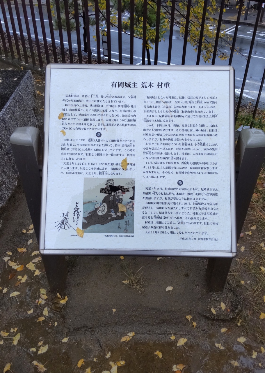 JR伊丹駅すぐにある荒木村重の居城として有名なお城の跡地です。大河ドラマにもなった黒田官兵衛が幽閉されたお城としても有名です。