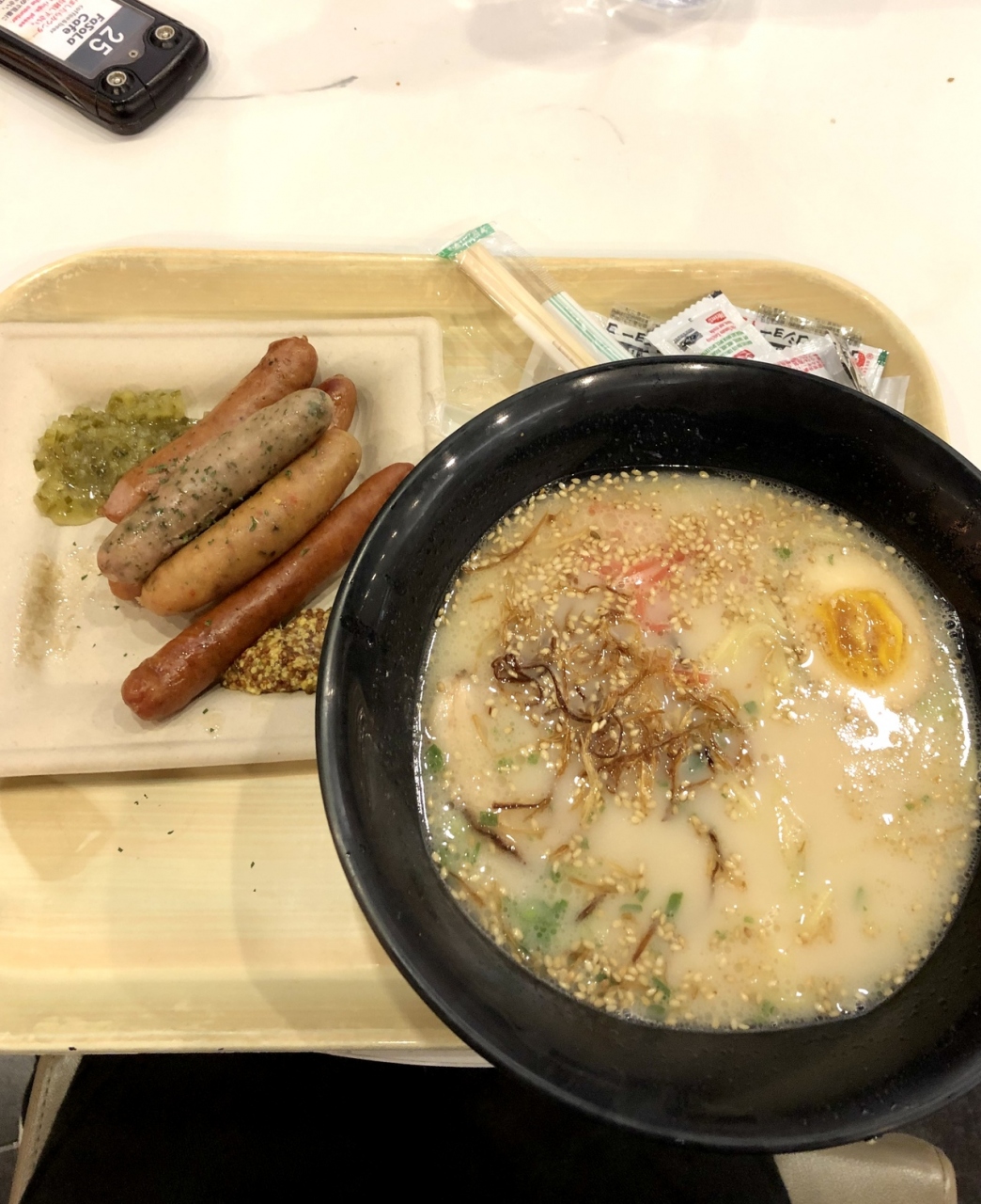 ソーセージ盛り合わせと豚骨ラーメンかな?