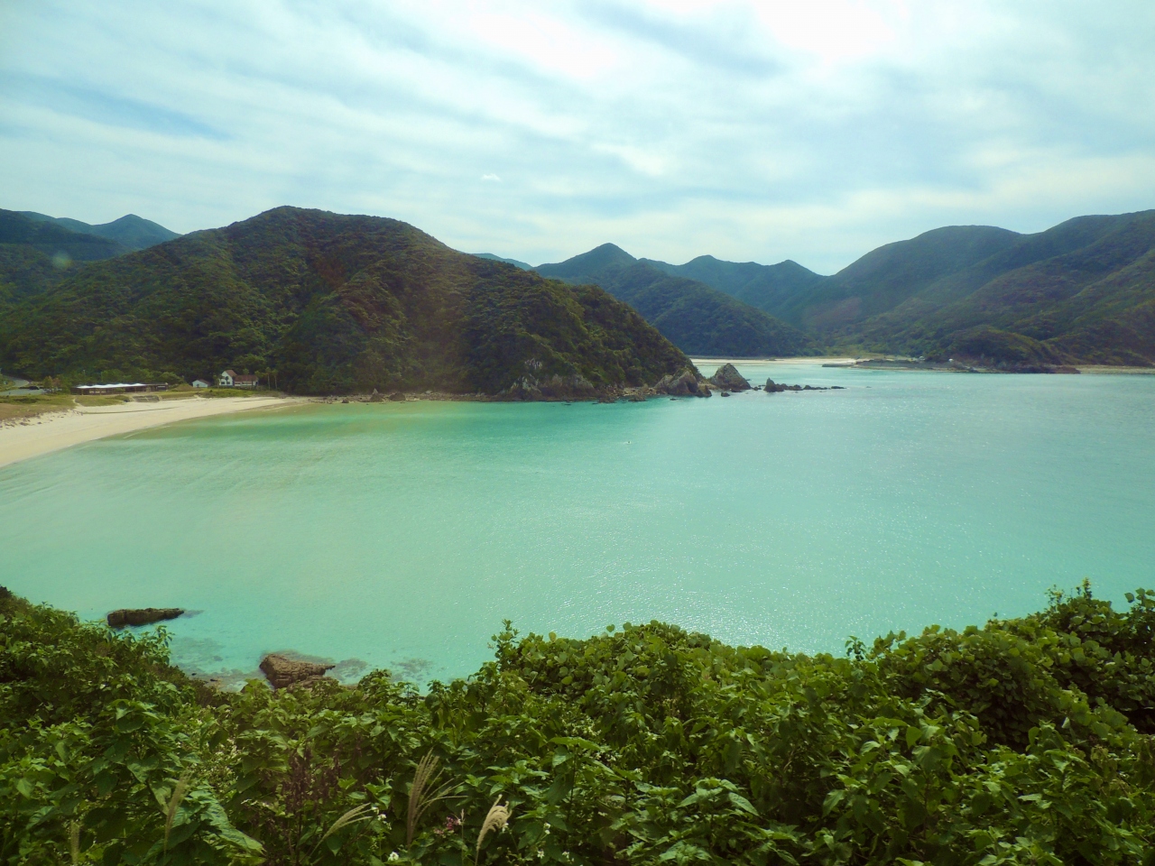 大瀬崎の断崖を見てから、西側を北上すると、日本一美しいのではと思うくらい美しい高浜ビーチがありました。シーズンを過ぎているので、人っ子一人おらず、静かでした。この近くには魚籃観音展望所もあります。観音様に向かって左手は白浜の高浜、右手には断崖の貝津港をのぞめます。