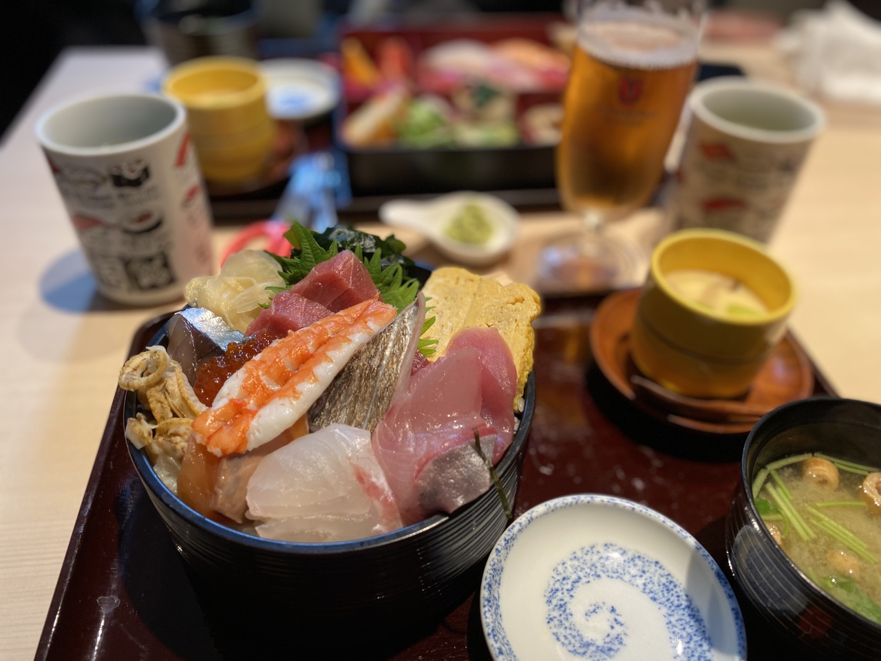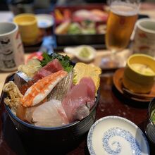 大船駅近くにある海鮮居酒屋です。この日は親戚の家の近くに行く途中に親子4人でランチをしました。豪華な海鮮丼と寿司定食を注文。子供が足りないようなので卵1貫からに握って貰いました。海鮮丼のネタは新鮮で大満足です!