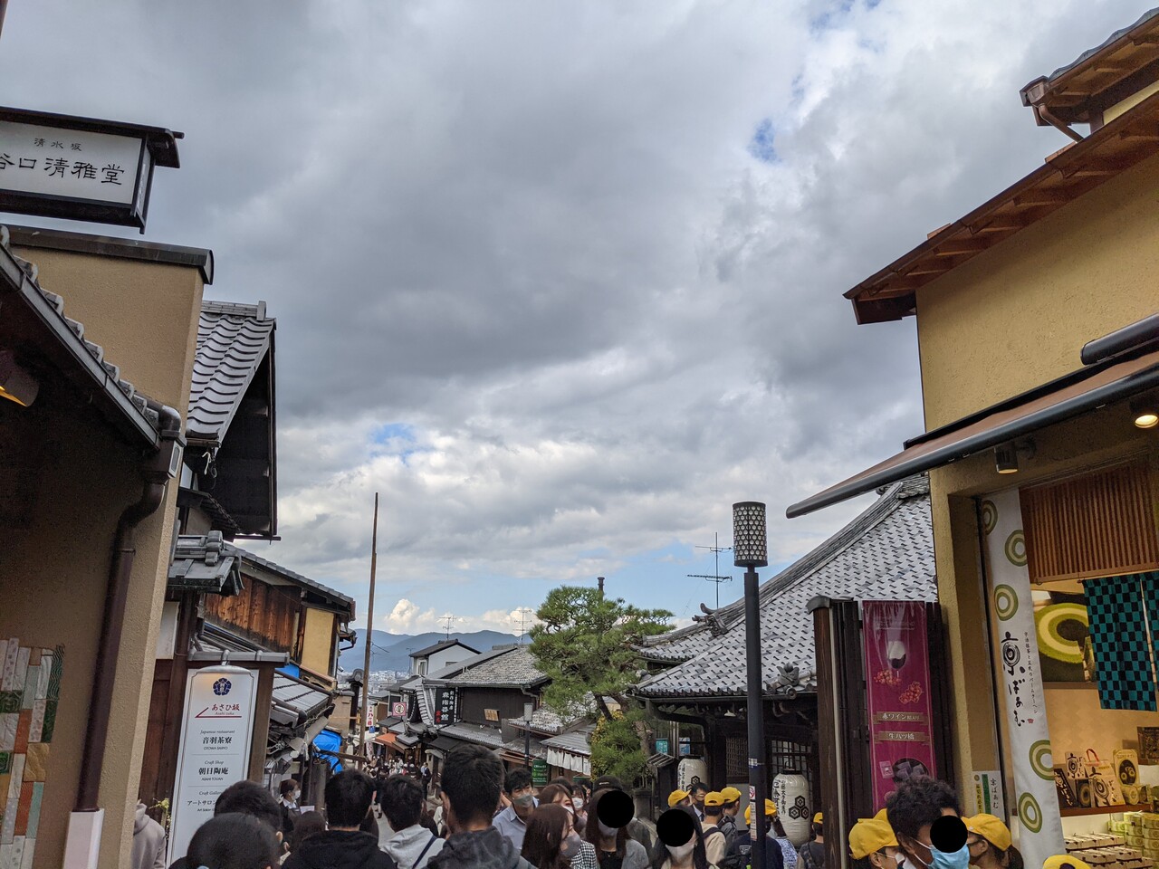清水坂は、清水寺に続く参道のひとつです。参道沿いには、たくさんのお土産屋や飲食店が並んでいました。コロナ禍と言うこともあり、外国人観光客はほとんどいませんでしたが、修学旅行生などでかなり混雑していました。