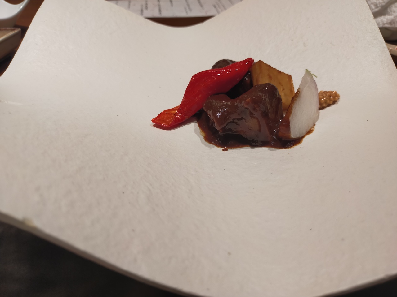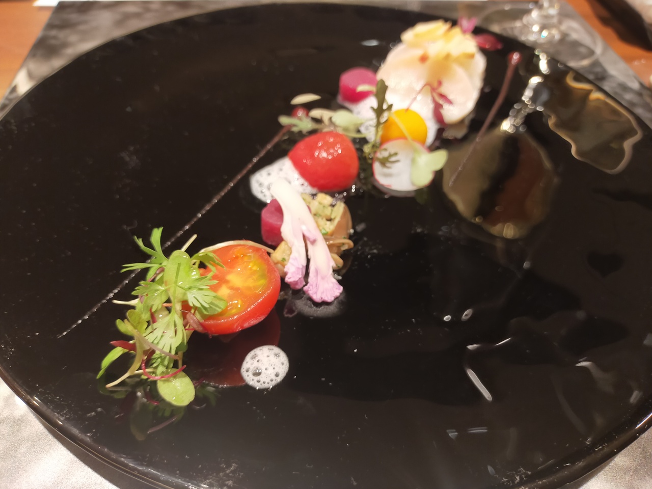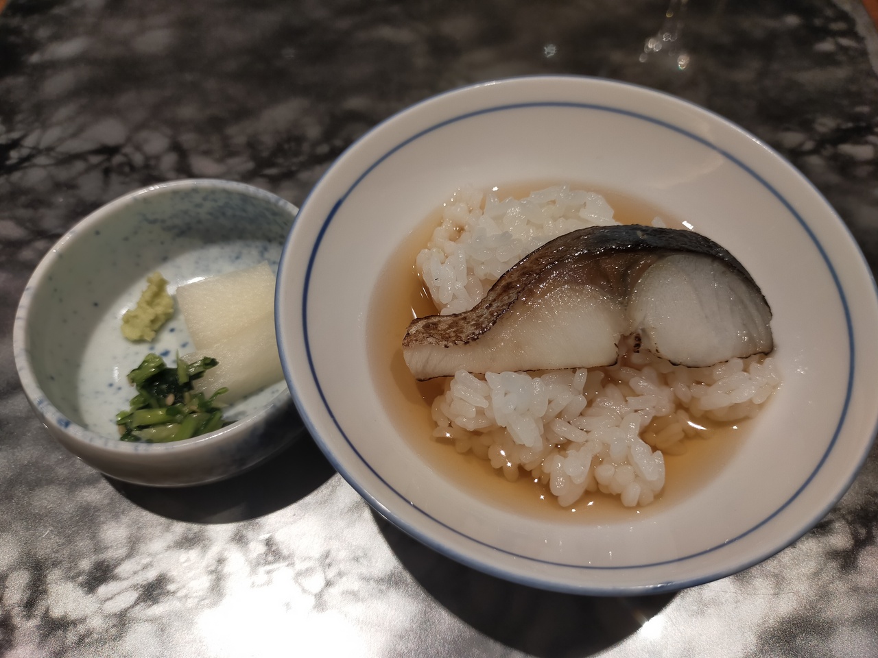 リ一ガロイヤルホテル京都の地下一階にあるフランス懐石レストランです。カウンター席が並んでいて、時節柄ふた席ごとに、透明仕切り板がありました。少量の見ても楽しめる料理が、工夫された器で出てきます。じっくり煮込んだ京都ポ一ク、最後に鯖がのったお茶漬けも京都らしかったです。