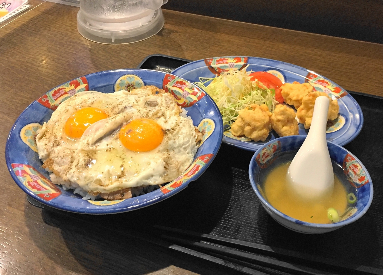 ご飯に焼豚を載せ、甘辛いタレをかけ、半熟目玉焼きを載せたシンプルな丼飯です。