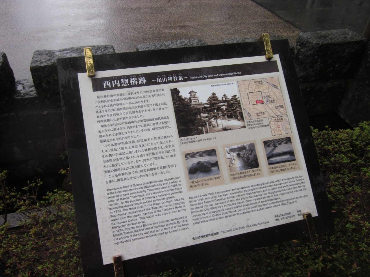境内を歩いていると、金沢城惣構跡の案内の看板がありました。後からネットでも調べて見ましたが、この辺り一帯は、金沢城の外壁があったようで、その大きさも物凄い範囲のようだったようです。もちろん、尾山神社の周辺もあったようです。そう考えると、金沢は、歴史ある凄い場所なんだと感心しますね。もちろん、兼六園も外壁の中に入っています。