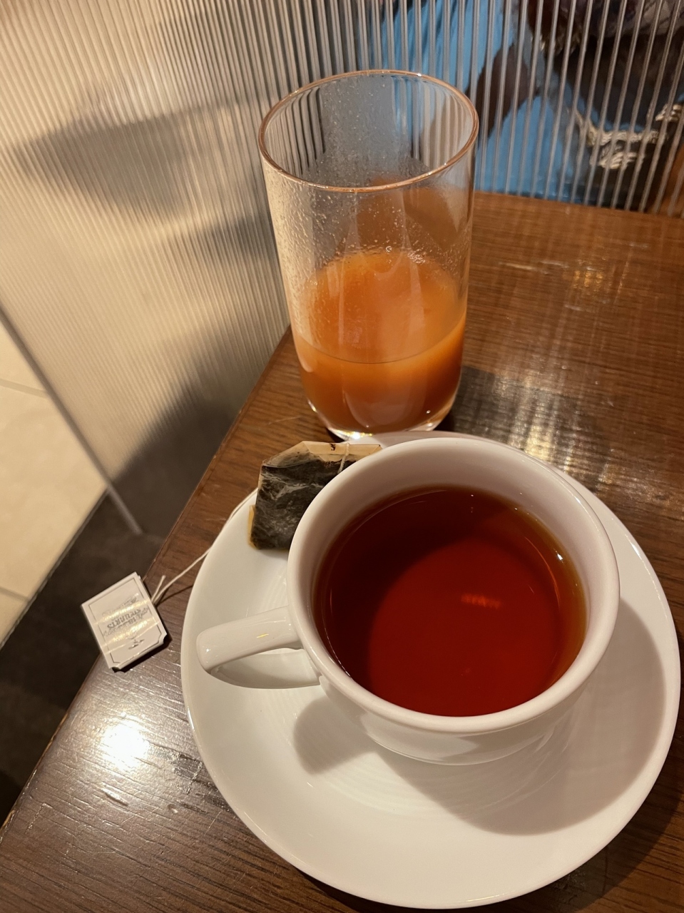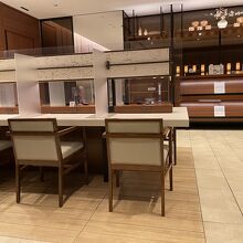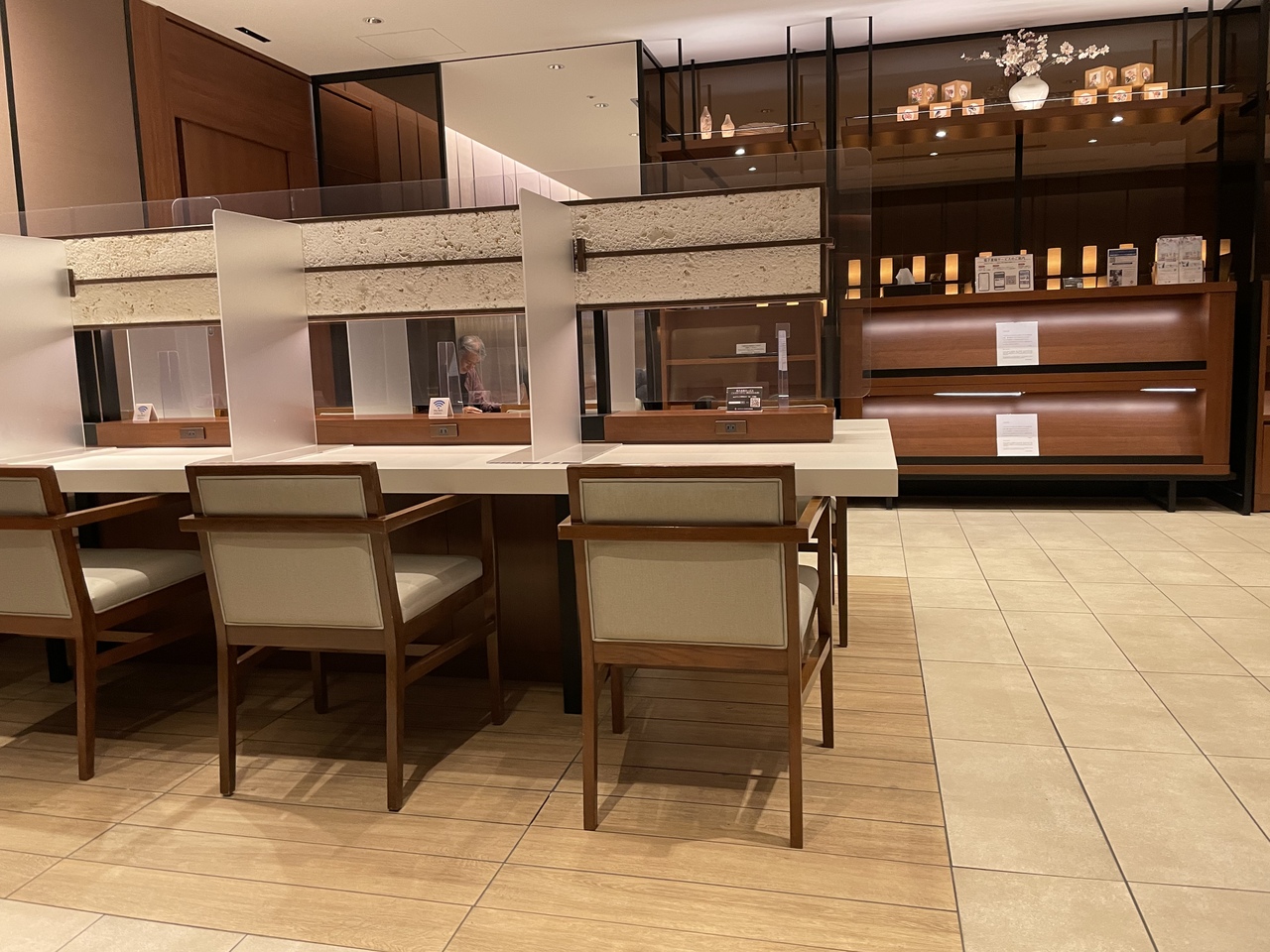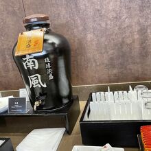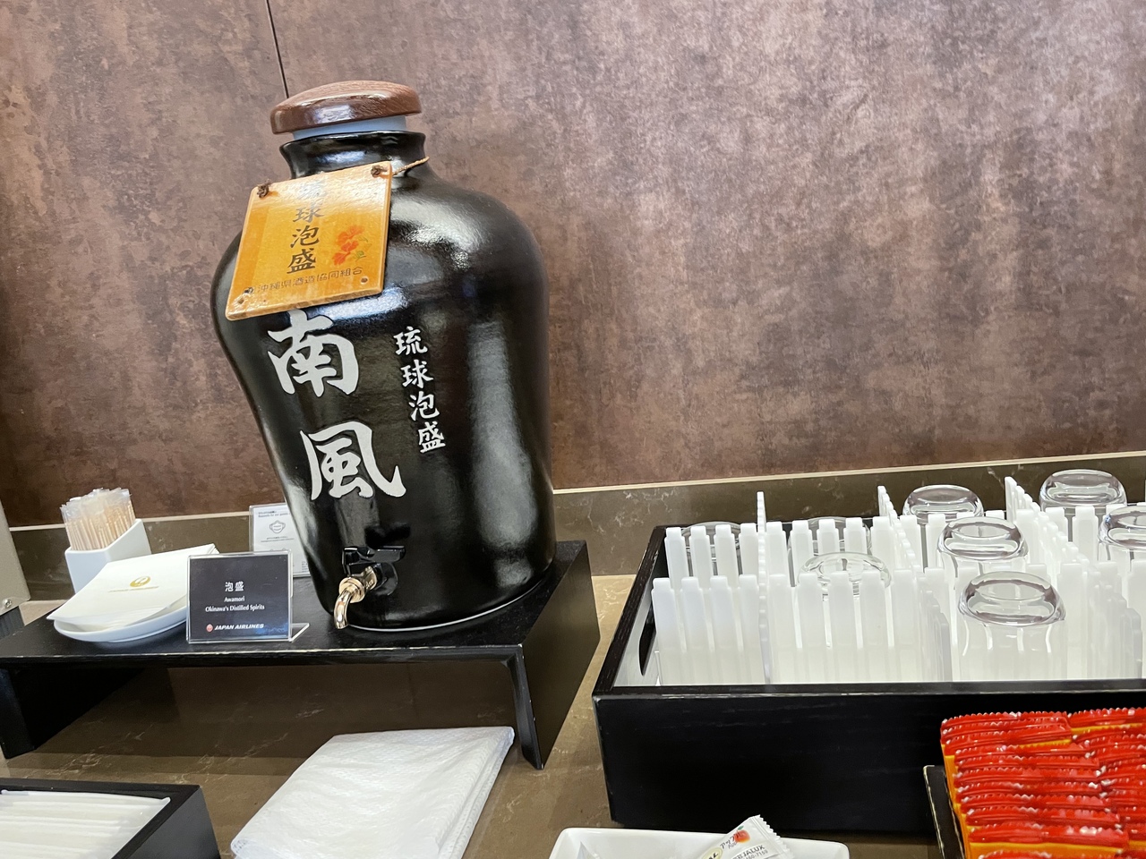羽田や成田などに比べると小規模ですが、静かに時間を過ごすことができます。グァバジュースなどソフトドリンクとアルコールは、ビールの他に泡盛がありました。おつまみは個包装のハッピータンです。1人席が中心で座席と座席の間にはアクリル板がおかれています。