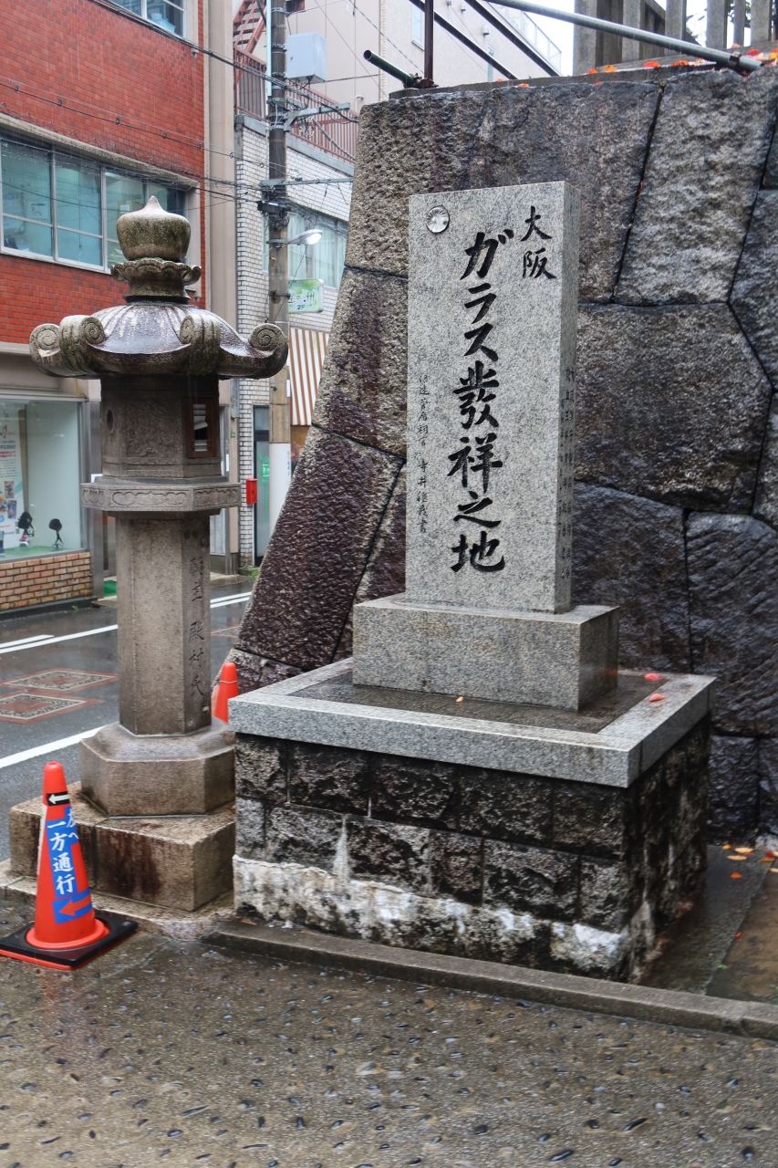大阪天満宮の恵比寿門の西側に大阪ガラス発祥の地碑があります。現在、天満宮の周辺にはガラスを作っている所は見かけませんが、この地で宝暦年間1751年~1764年に長崎の播磨屋清兵衛がオランダから伝わったガラス製造を始めたそうです。