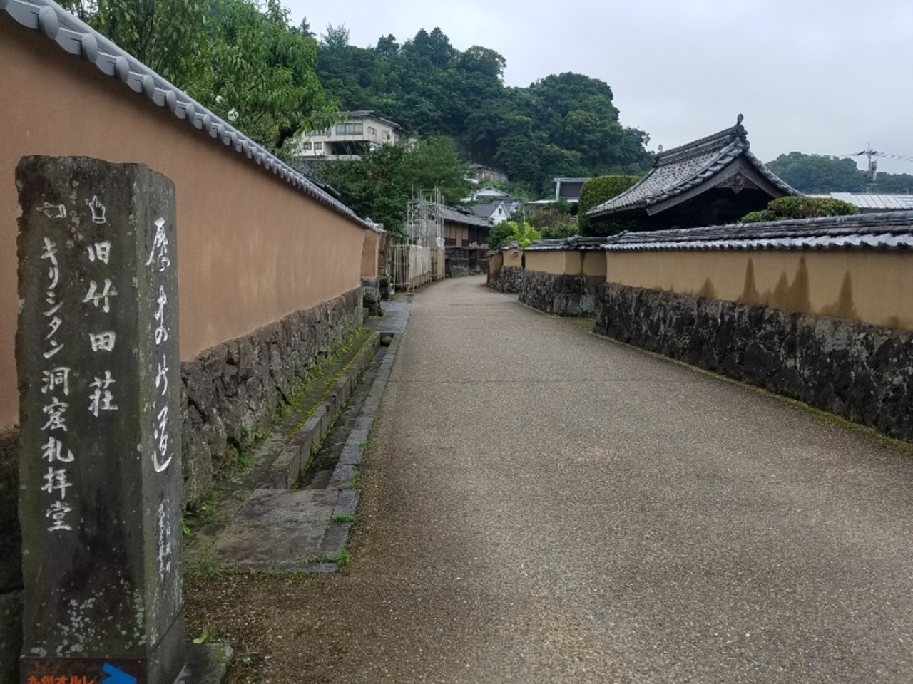 キリシタン洞窟礼拝堂を見てきた後に歩いてみました。道の左右に土塀が続いていていい雰囲気ですがよく見ると傷んでいる塀もあれば古田屋仲門長屋門のように特にきれいに修復されているものもありますね。茶色い壁に目が行きがちですが下半分の石垣も様々な造りがあるようで見比べながら歩くのもよいと思います。