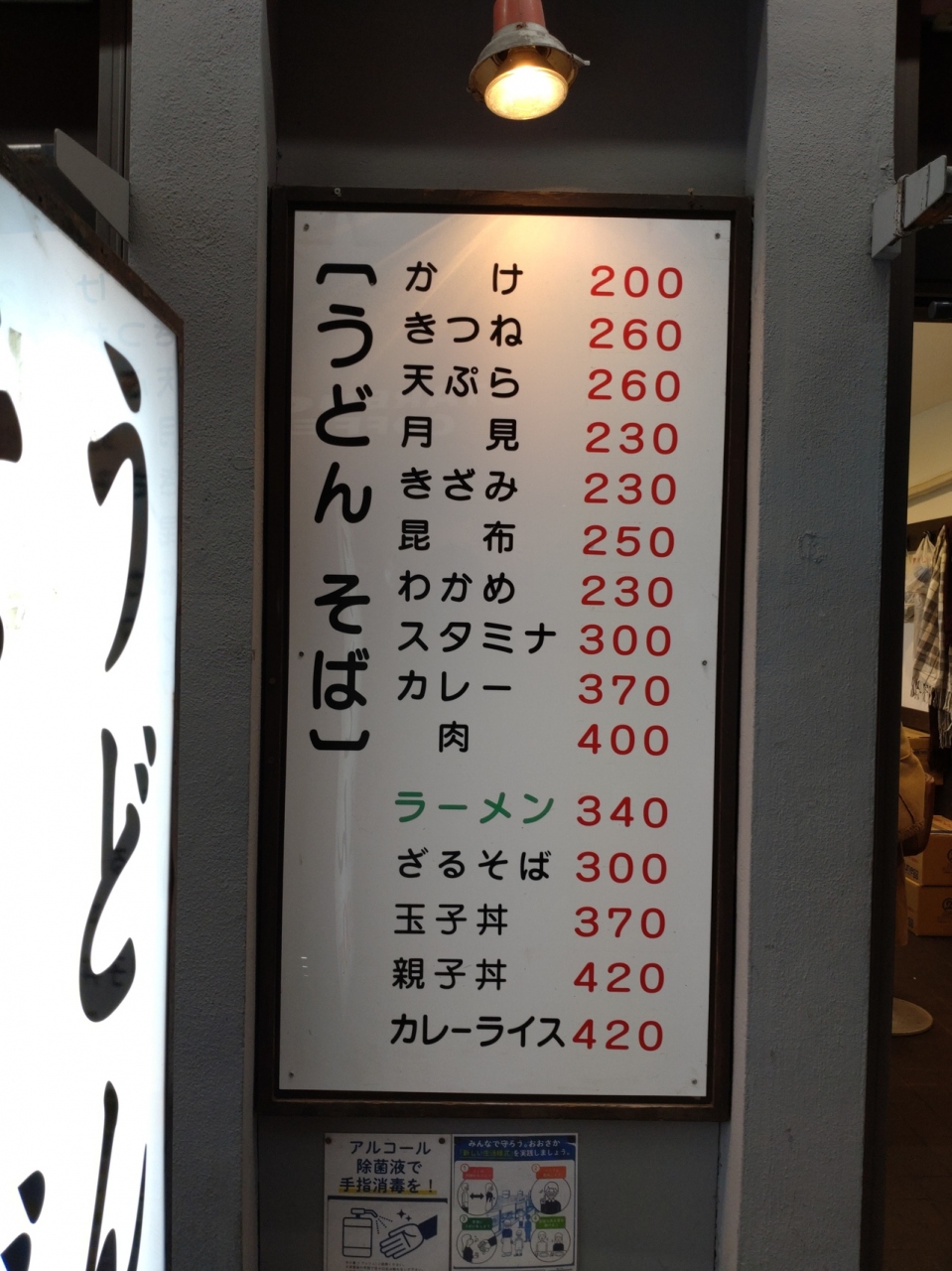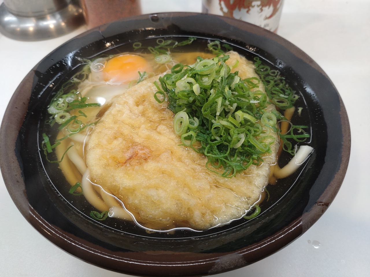 南海なんば駅からすぐ、なんば南海通商店街はいってすぐのところにあるうどん店。カウンター席のみ(従って立ち食いスタイルではない)のお店は、昼時を過ぎてもお客さんが絶えない印象。昭和風の外観、店内のお店は、お店の雰囲気とは合わない現金専用の食券機が2台ある。まず、驚くのかその安さ。かけうどん200円、きつねうどんが260円、カレーうどんが370円、肉うどんが400円(これでも値上げしたとのこと)。しかし、さすが大阪で鍛えられているお店。うどんは茹で麺なのでコシはなく、柔らかいものですが、お出汁はカツオガ効いた濃いもので、まさに大阪うどん。もちろん注文したらすぐに提供されるのも嬉しい。今回は天ぷらと生卵が入った「スタミナうどん」(いわゆる天玉うどんだと思う)を食べましたが、天ぷらにはイカが入っていて美味。まさに「安い、早い、うまい」の表現がぴったりのうどん店です。なお、そばの選択も可能です。