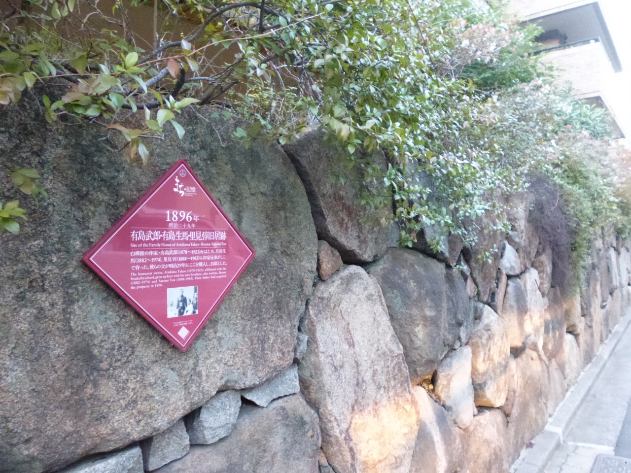 新宿通りから北に分岐する裏通り「番町文人通り」沿いにあるマンションの石造りの壁に「有島武郎・有島生馬・里見トン旧居跡」と記された肖像写真入りの案内板があります。明治の中期にこの地に住んでいたとのことですが、当時の町並みがどのようなものであったかは、想像するしかないのが残念です。
