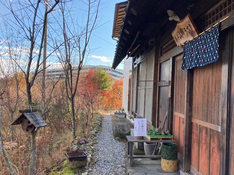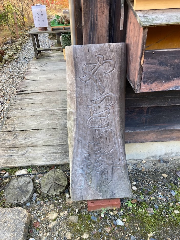 ここで合ってる?というような細い砂利道をのぼっていくと、営業中の看板と、喫茶店の回転灯が見えて安心。さらに「やっとります」の木の看板にほっこり。
