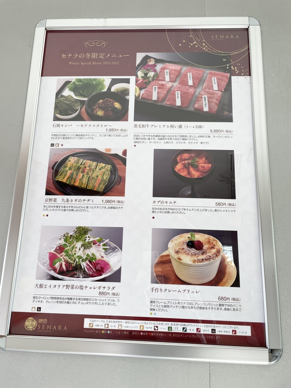 年末前に、家族で焼肉セナラに。ゆったりとした店内で落ち着いて国産牛の焼肉がいただけます。冬だけの限定メニューもありました。サイドメニューも充実していてお抹茶ティラミスがほろ苦くてとても美味しかったです。店内には浦和レッズの選手や芸能人のサインがたくさんありました。