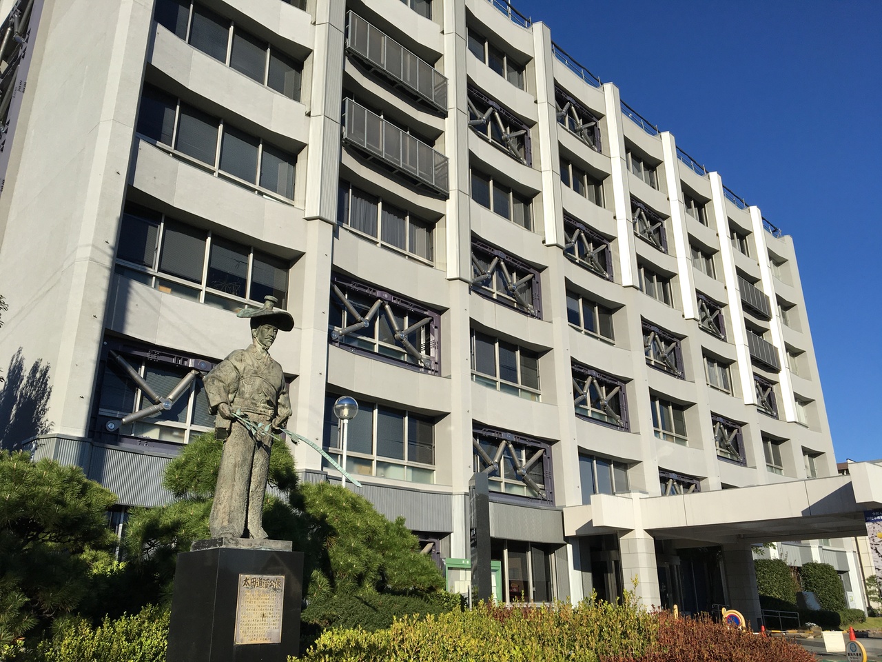 川越氷川神社に歩いて向かう途中、川越市役所の建物前に建つ太田道灌像を見つけました。太田道灌というと、江戸城の築城に携わった人というイメージがあったのですが、川越城の築城にも携わっていたとは知りませんでした。この像が建っている場所は、川越城の大手門があった場所でもあるそうです。市役所から川越城本丸御殿も歩いて行けるので、一緒に観光するのがオススメです。
