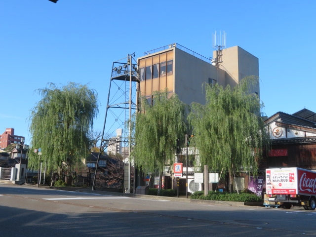 大正時代に建てられた火の見やぐらです。あまりに普通に建っているので、これが火の見やぐらだとは、正直気が付きませんでした。周囲には、柳の木が3本あって、ちょっと隠れたようになっています。古さを感じさせない建築物です。