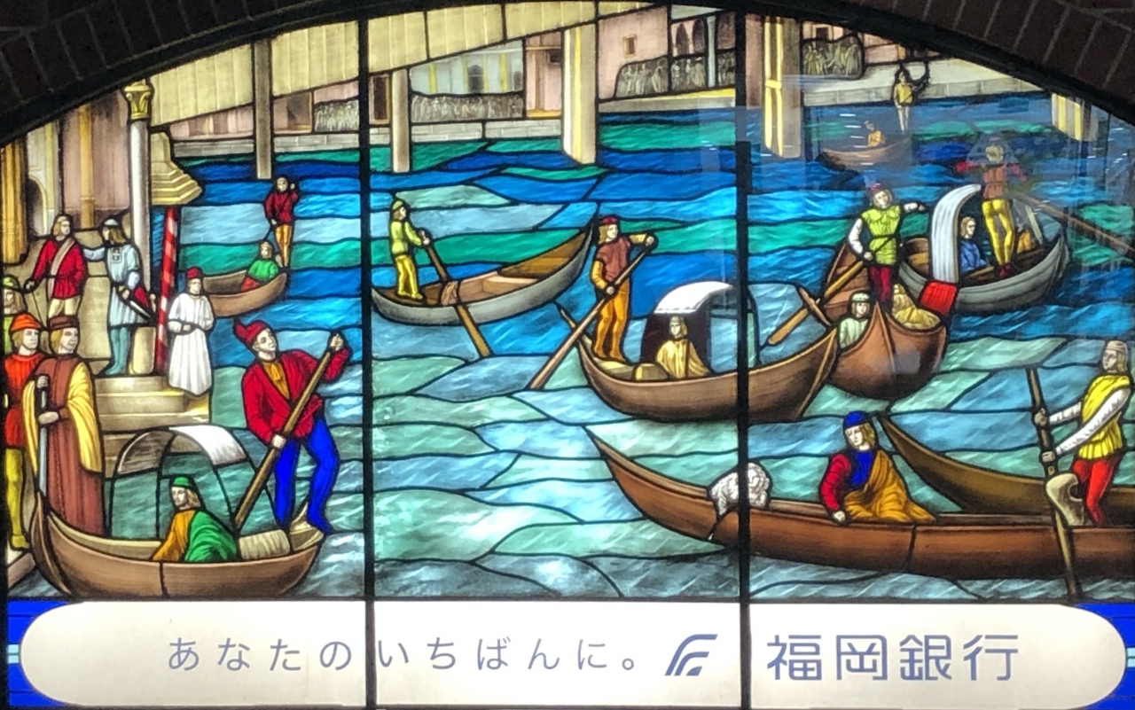 天神の地下に広がる巨大ショッピングモールです。飲食店、本屋、雑貨や、洋品店などがあり、お買い物が楽しいです。ヨーロッパの街並みをイメージして作られており、石畳で、ステンドグラスがところどころに飾られています。