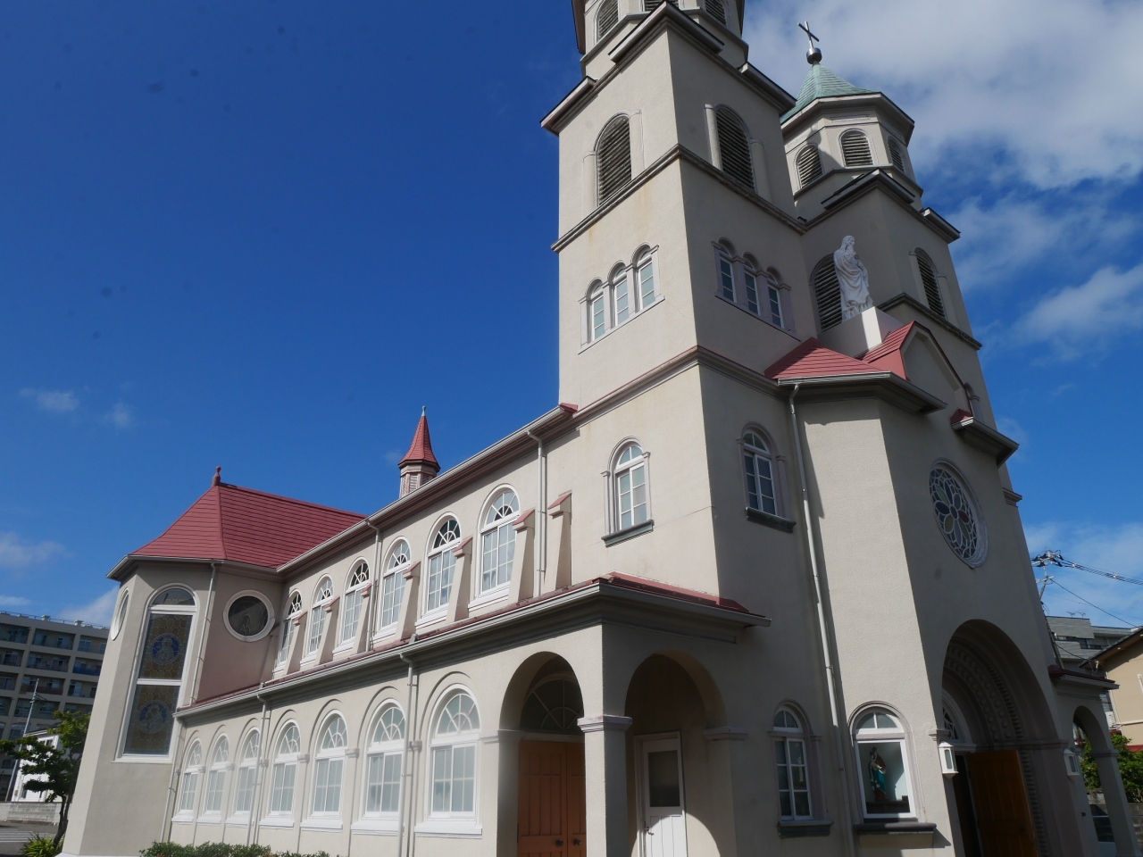 大きな教会でステンドグラスが綺麗です。