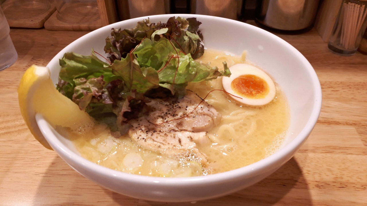 うまみの凝縮したこってり濃厚な鶏白湯スープですが、トッピングのサニーレタスとレモンでさっぱりとし、バランスがとれています。