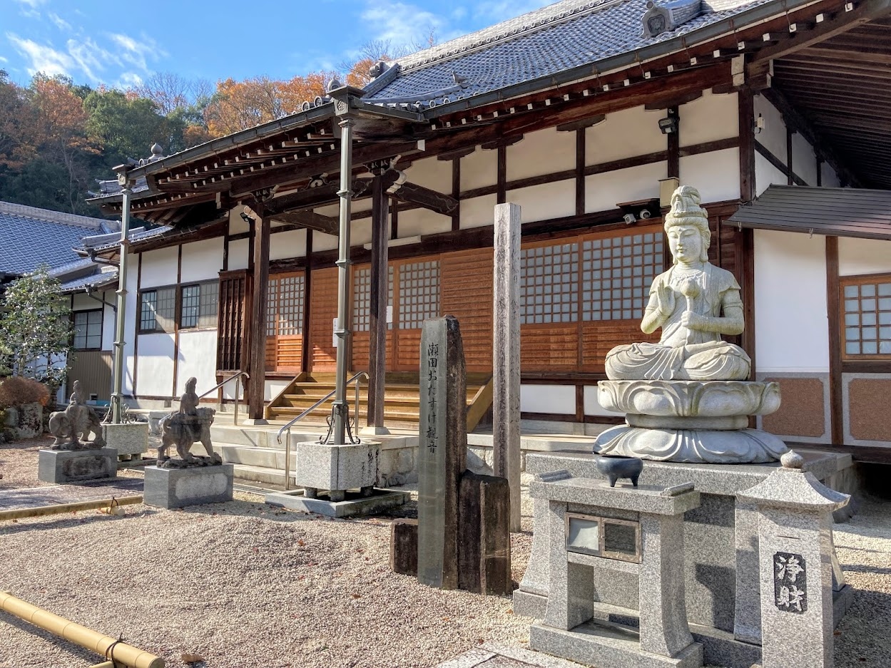 日本一大きな明智光秀公のご位牌と目坐像がありますが、残念ながら現在は境内拝観は停止中で見ることはできません。境内には、立派な本堂があり、本堂の右前には「瀬田おたすけ観音」さまが安置されていました。