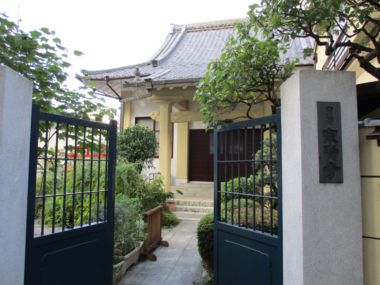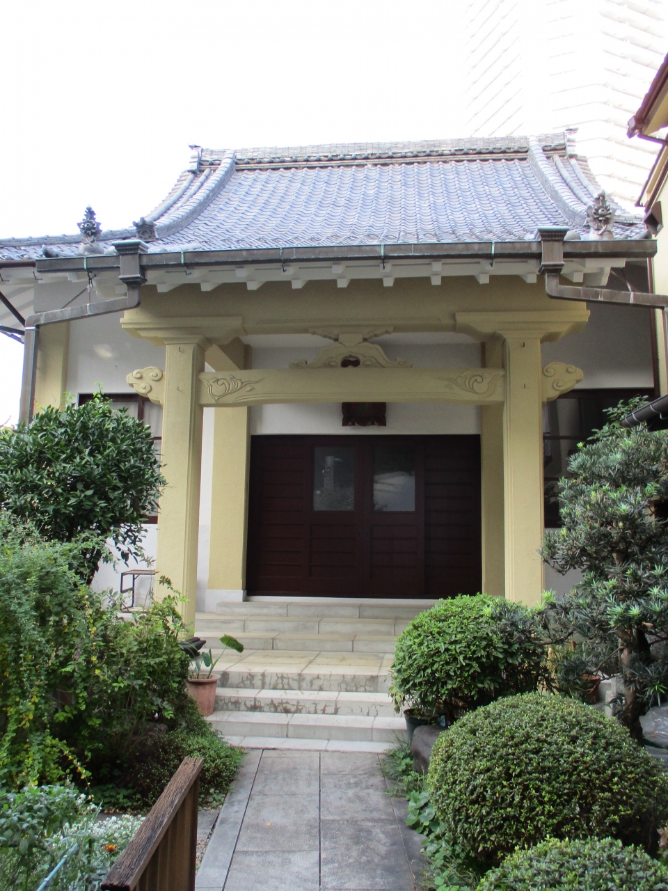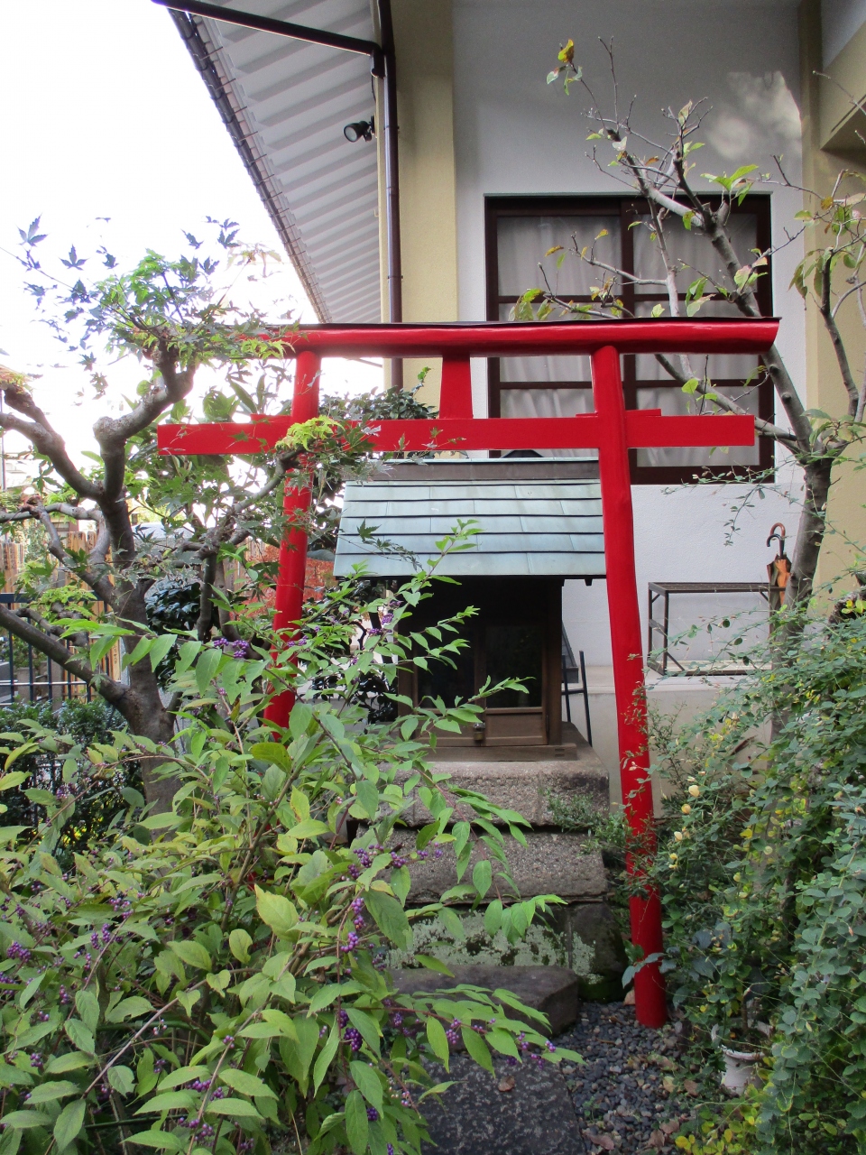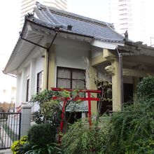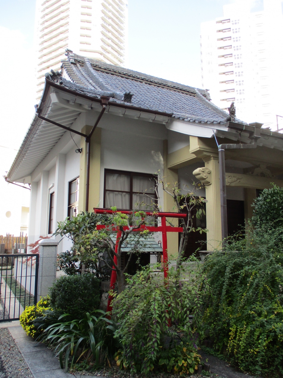 池之端周辺を散策していて、忍岡小学校の裏手にお寺を見つけたので立ち寄りました。本堂はコンクリート製で、あまり趣などはありませんでした。境内に入ると赤い鳥居が建てられていましたが、本堂のすぐ脇に寺社と神社の鳥居が一緒なので不思議な気がしました。