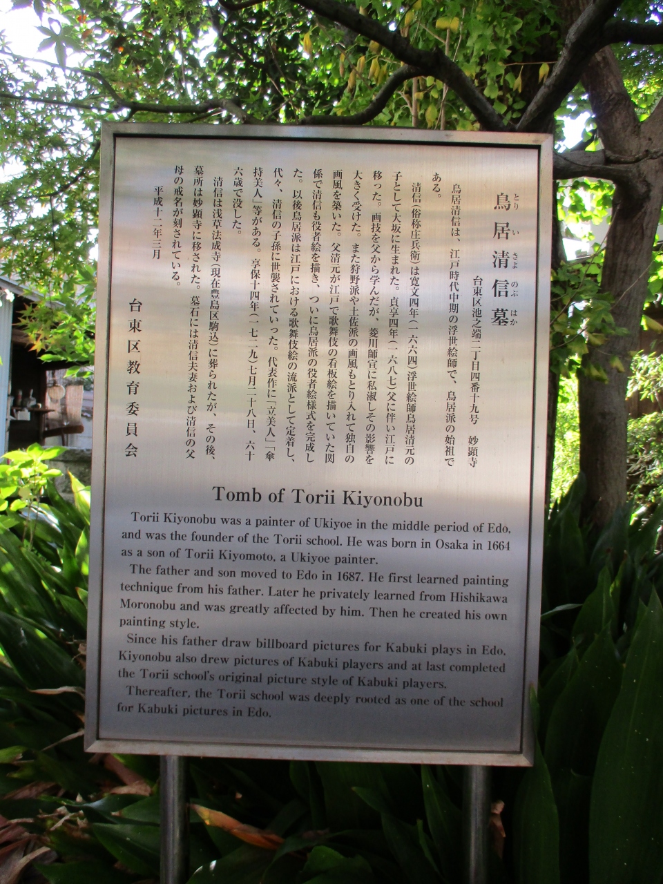 上野の池之端周辺には寺院が多いので、お寺巡りをしていた時に立寄りました。敷地の規模は大きくありませんが、しっとりとした落ち着きのある雰囲気の寺院でした。また江戸時代の浮世絵師、鳥居清信という方のお墓がある旨、案内板が立てられていました。