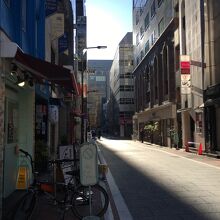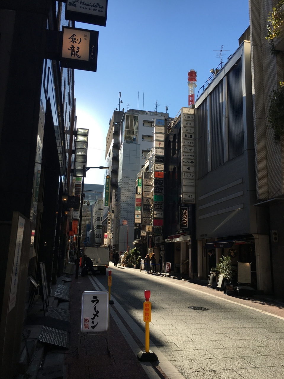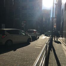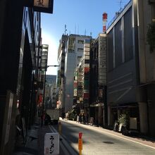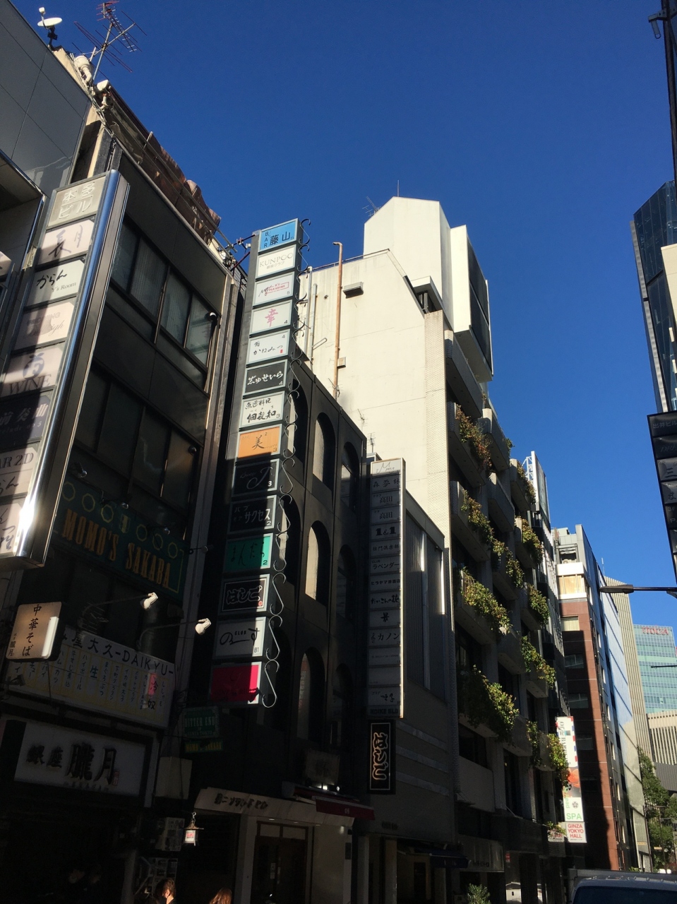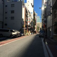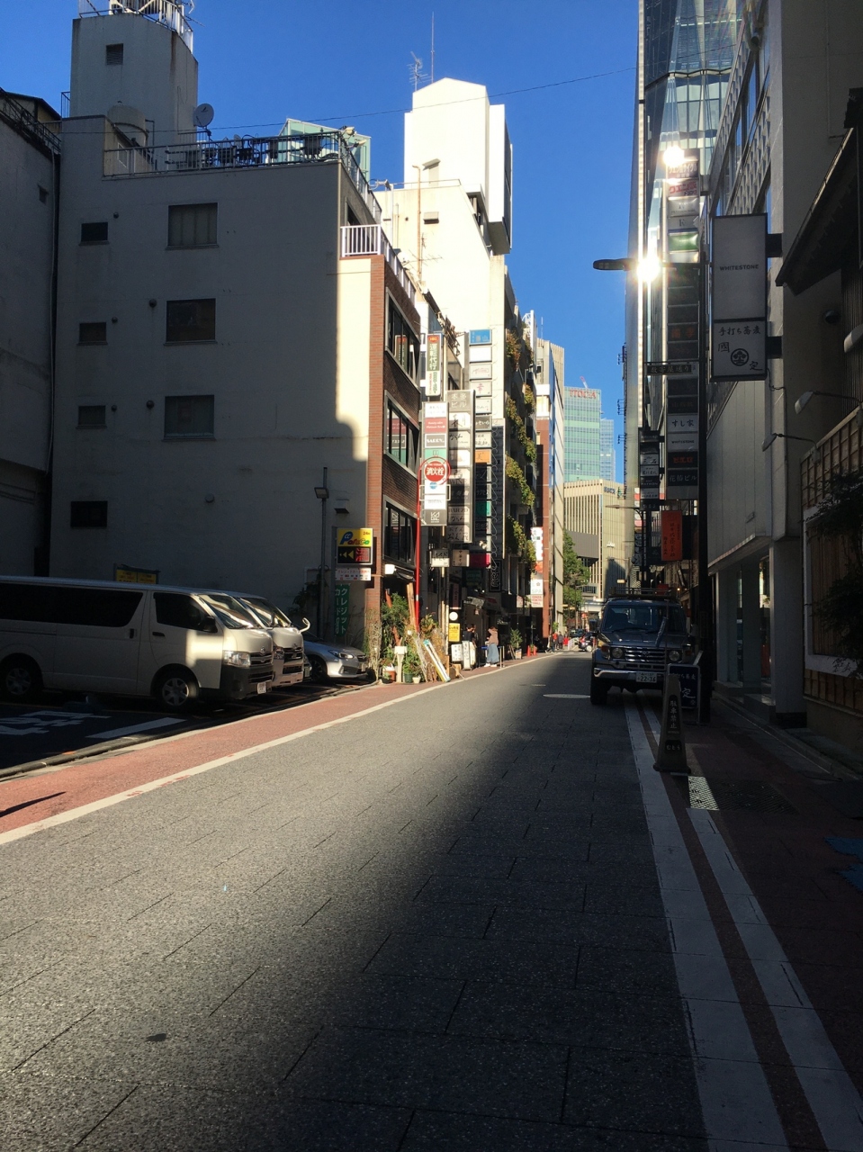 自動車がすれ違うことが出来ない程の道幅でした。左右にはビルが連なり高層ビルはなかったです。ところどころに食べ物屋があって行列があるラーメン屋がありました。あるビルには高級感クラブのような看板がいくつかありました。