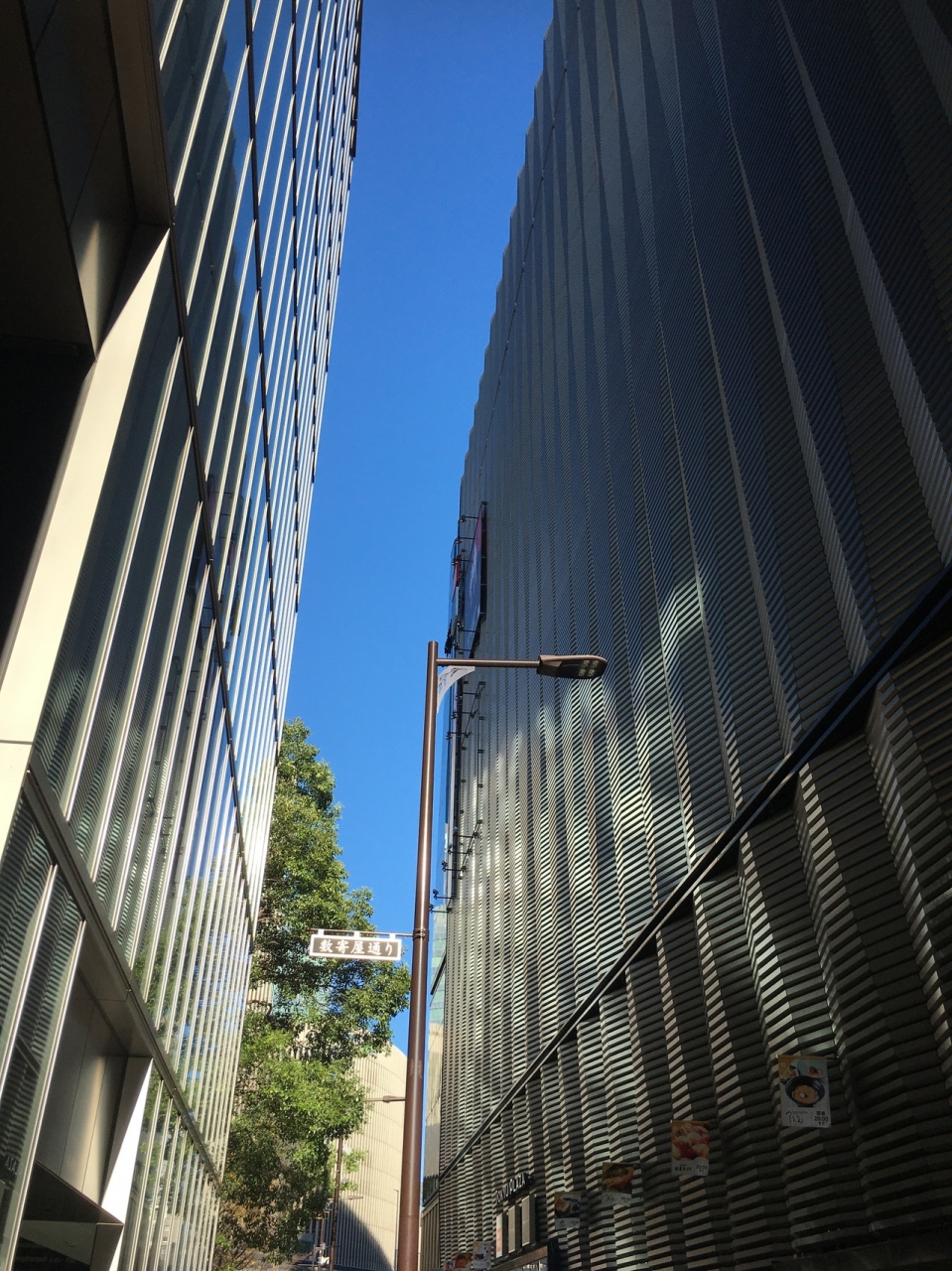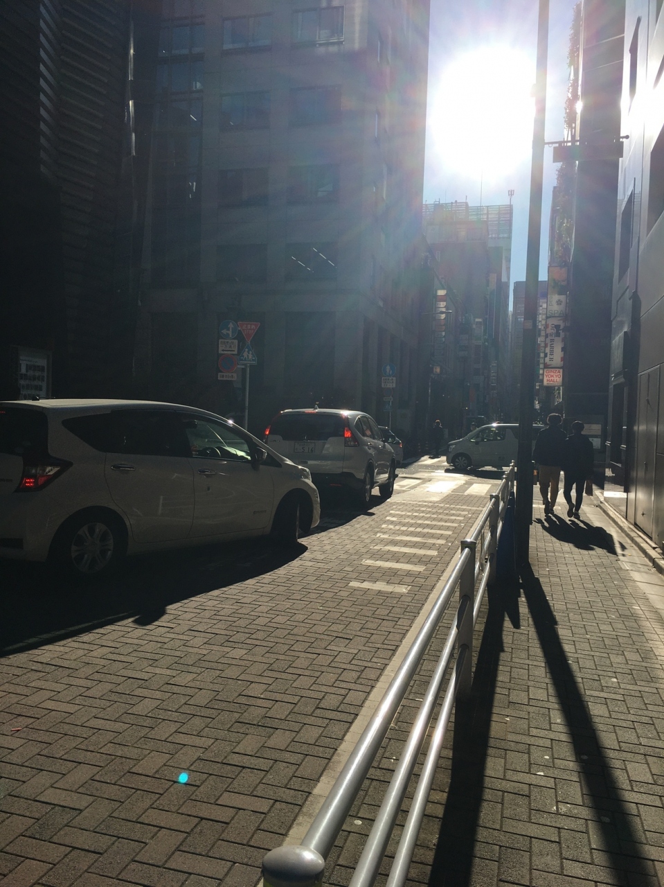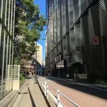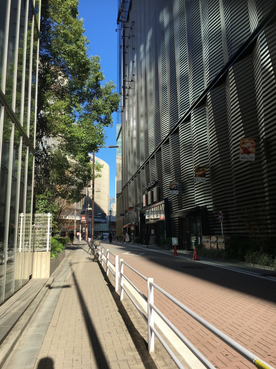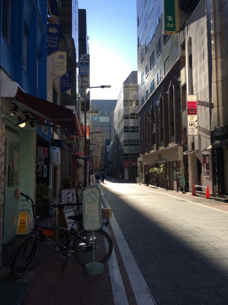 自動車がすれ違うことが出来ない程の道幅でした。左右にはビルが連なり高層ビルはなかったです。ところどころに食べ物屋があって行列があるラーメン屋がありました。あるビルには高級感クラブのような看板がいくつかありました。