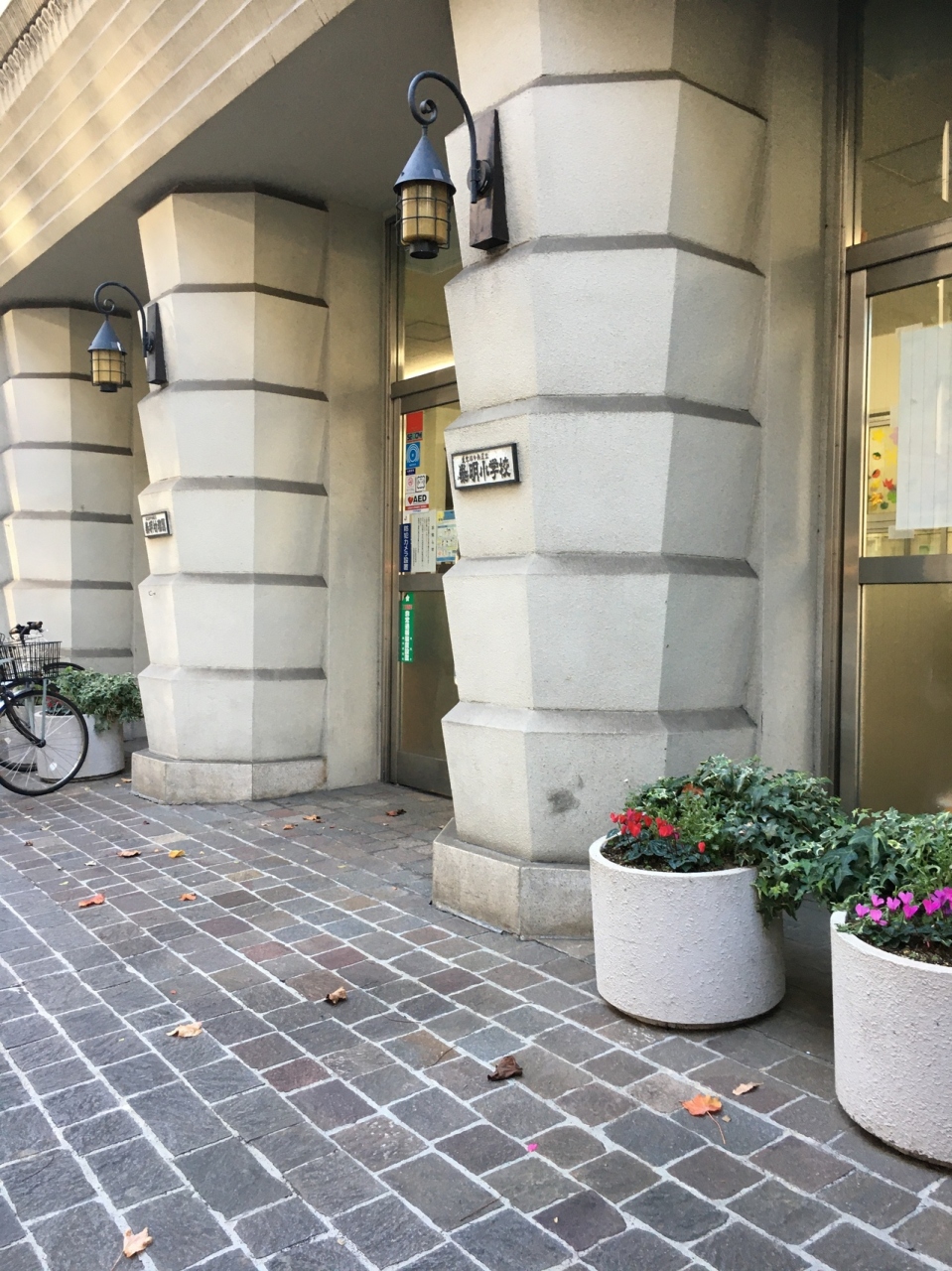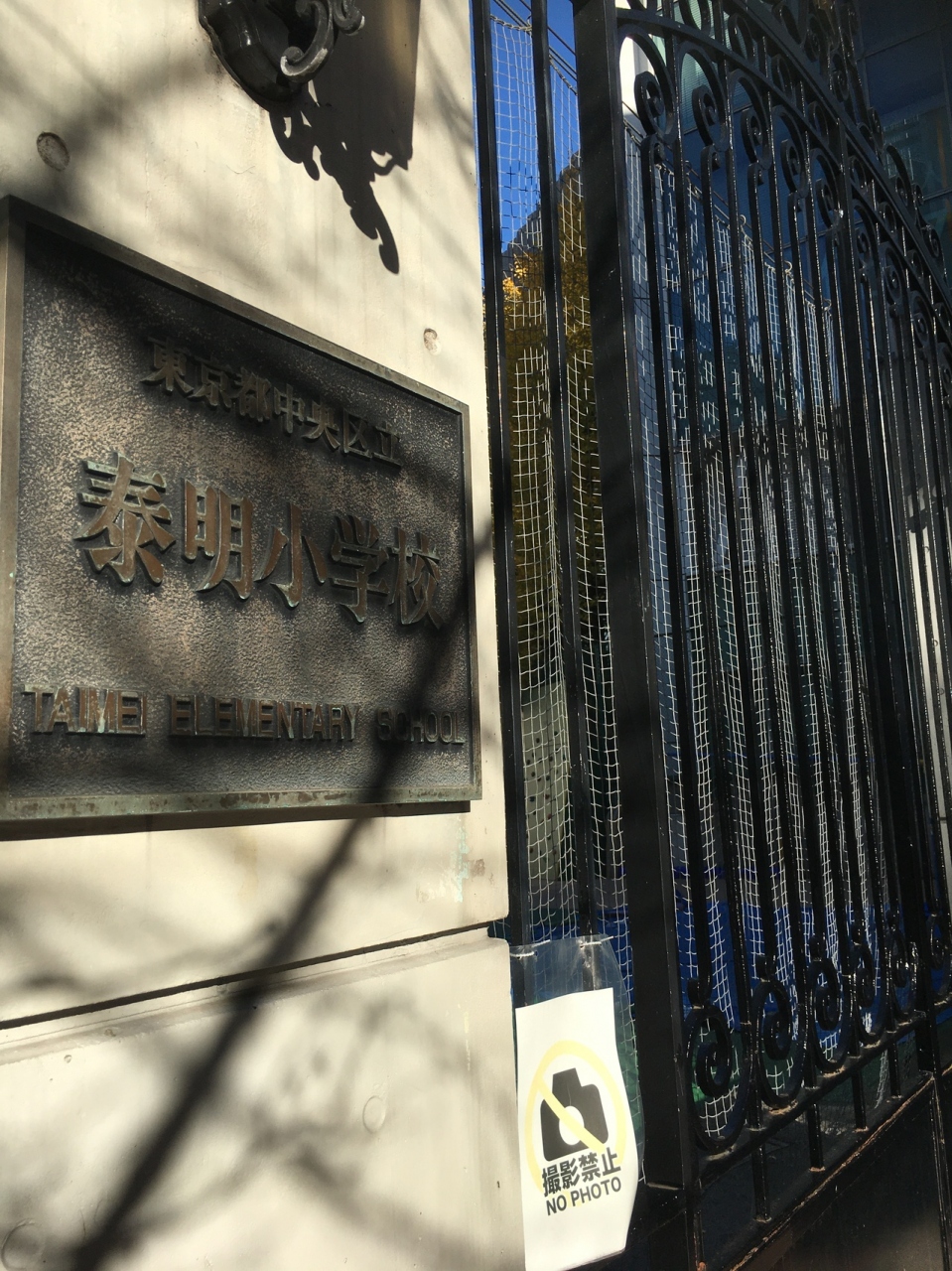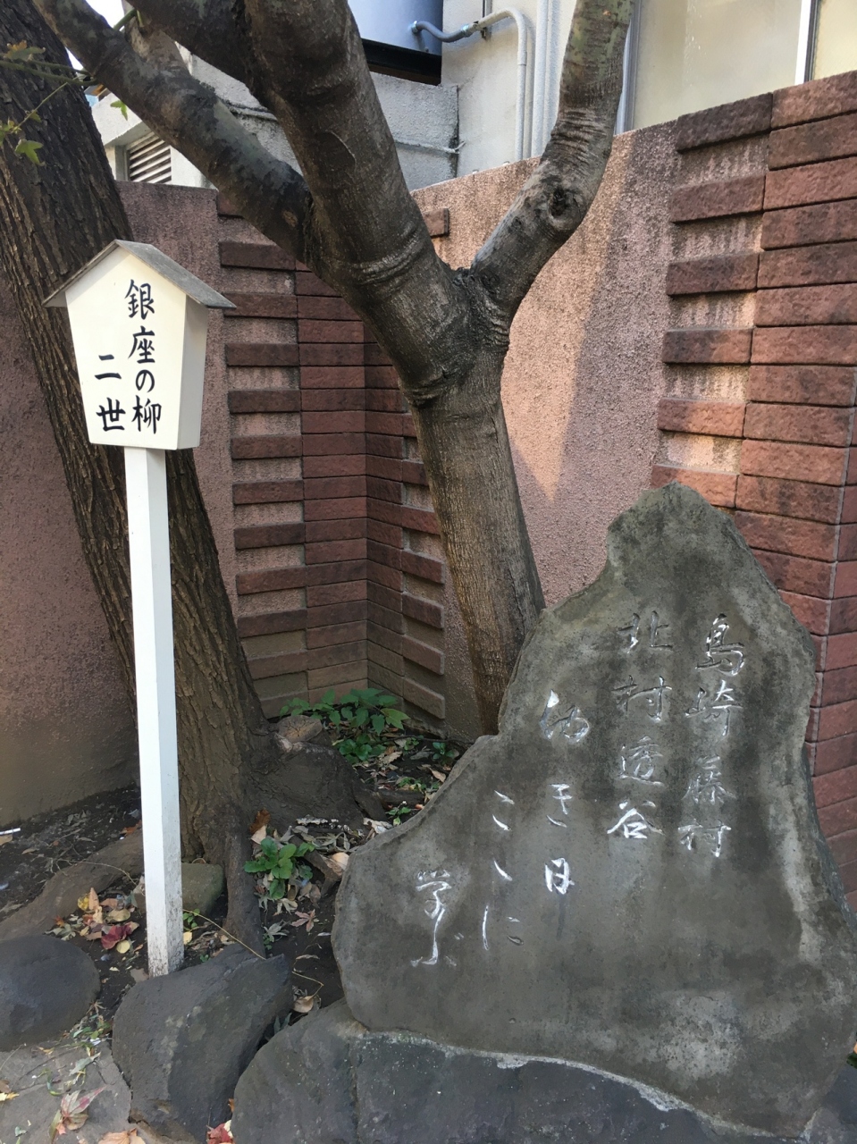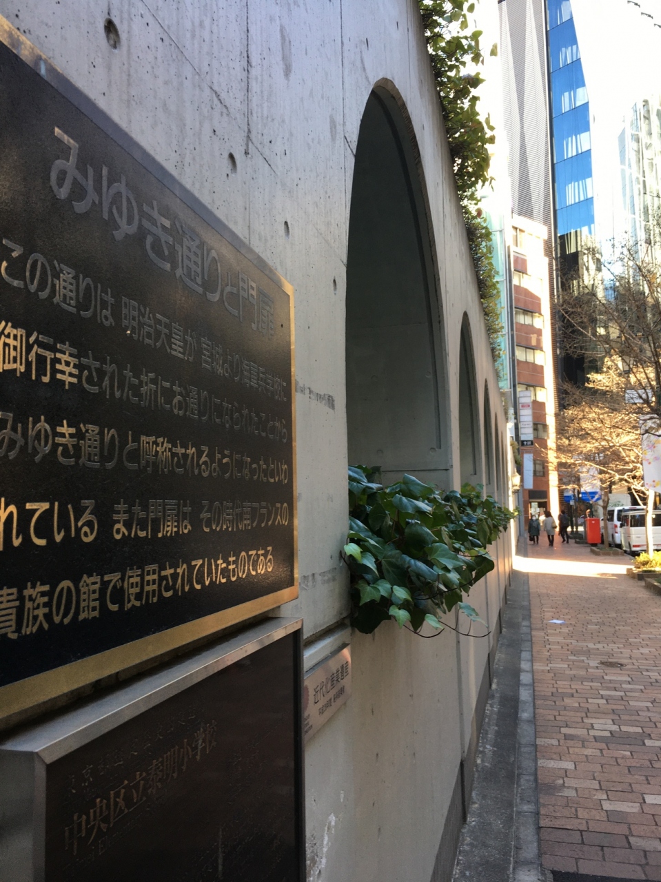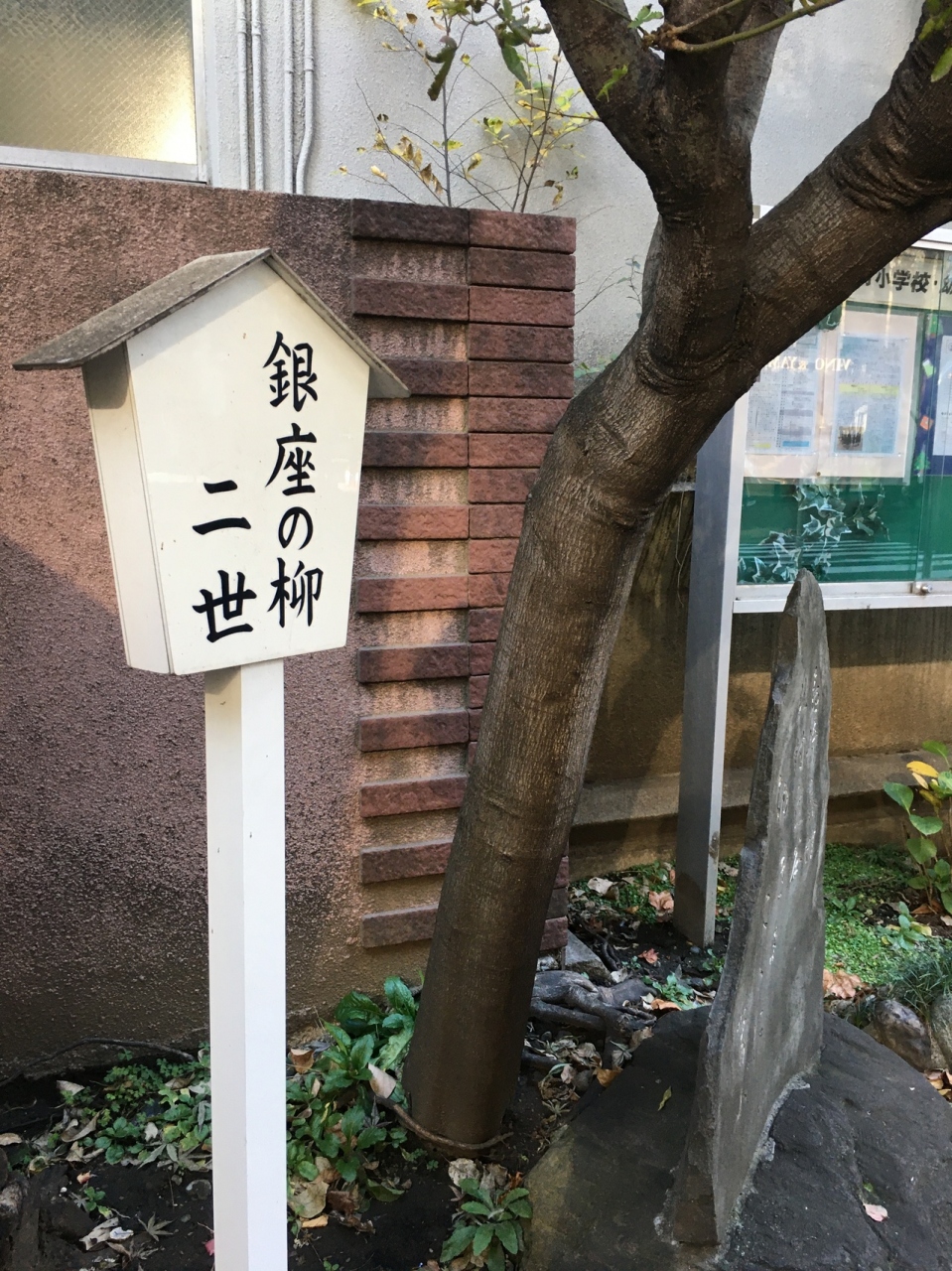 みゆき通りを歩いていると子どものにぎやかな声が聞こえてきて校庭で遊んでいました。都心にある現役の小学校で、柵があり厳重に囲まれていました。校庭は陸上のトラックのレーンが引いてあり、屋上には網が掛けられていました。柳の木の碑が正門玄関横にありました。