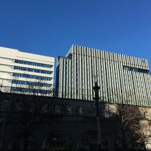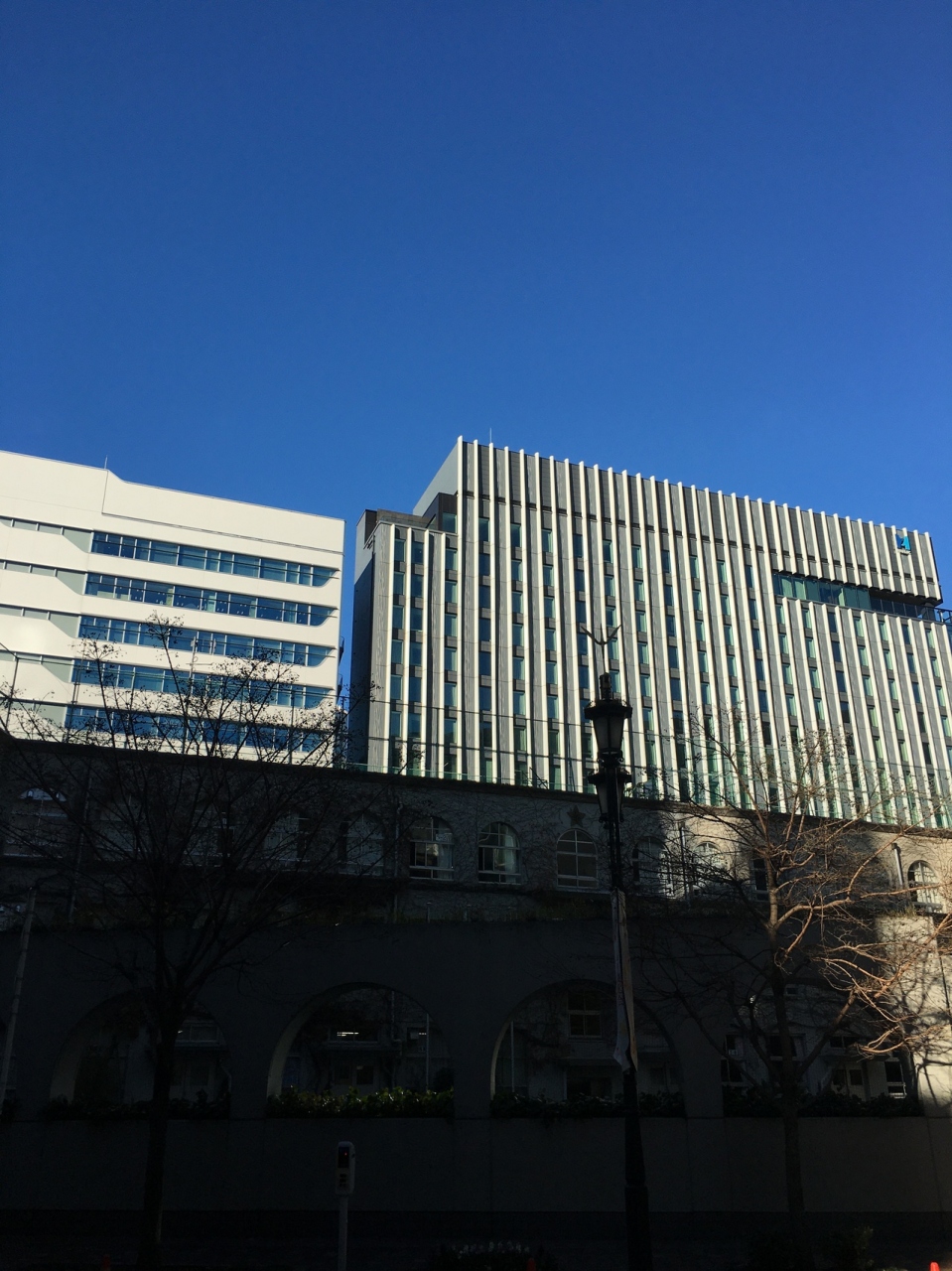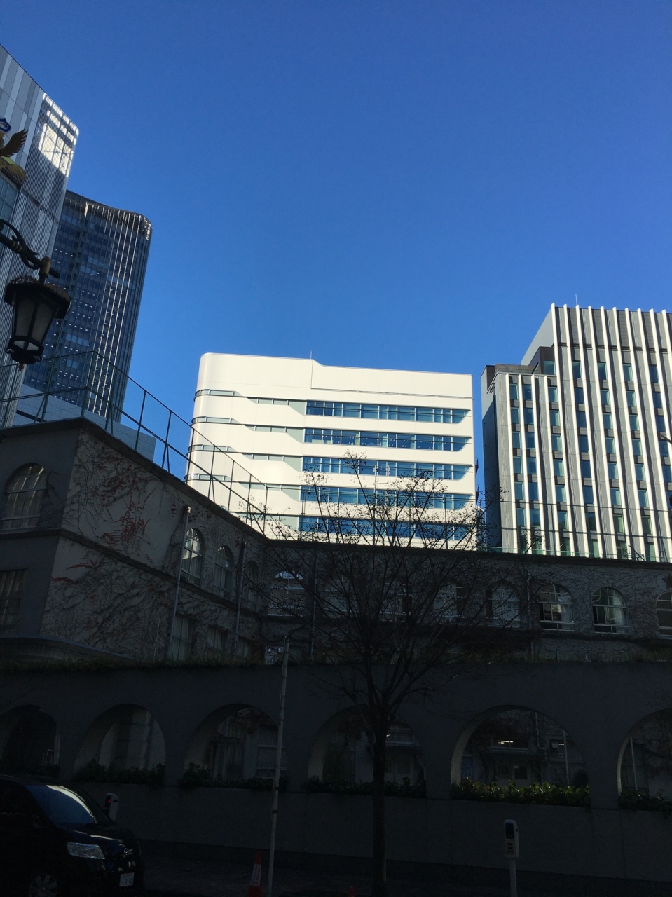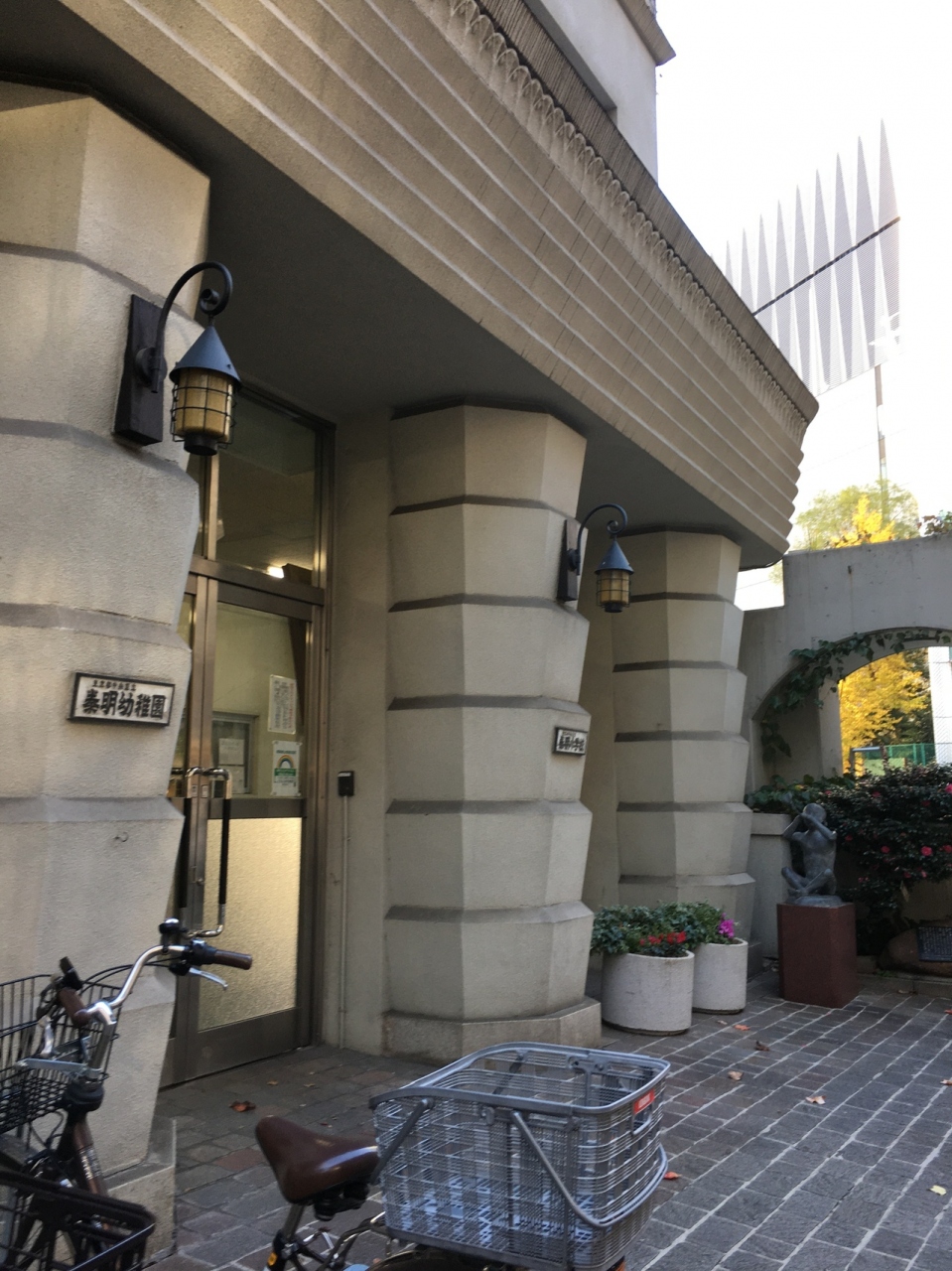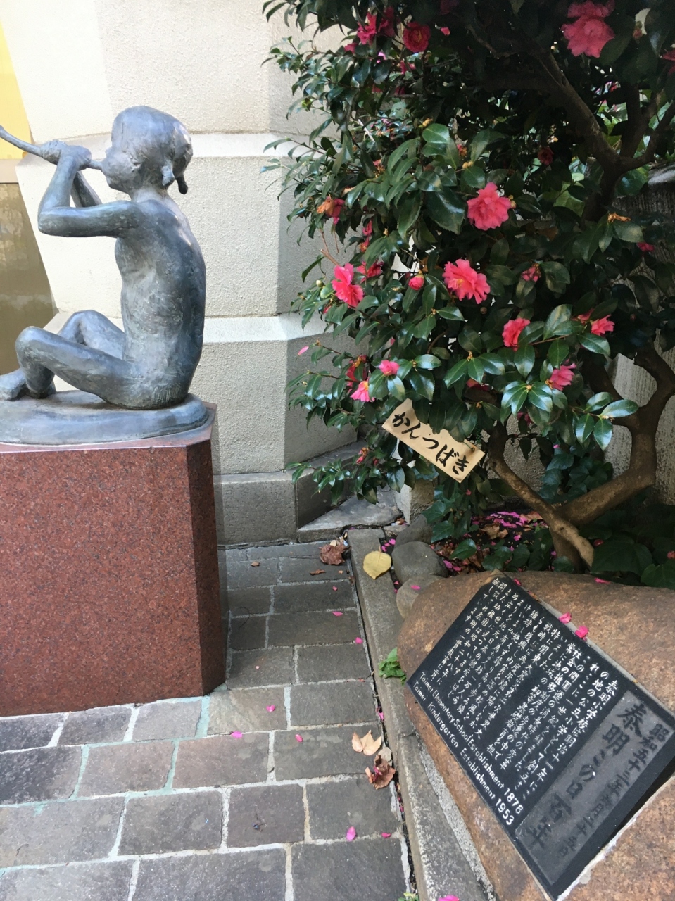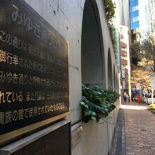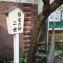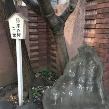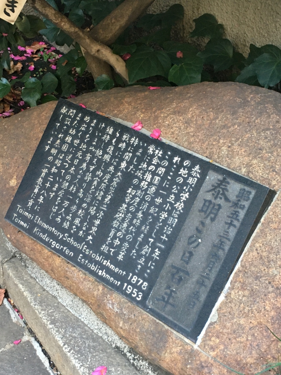 みゆき通りを歩いていると子どものにぎやかな声が聞こえてきて校庭で遊んでいました。都心にある現役の小学校で、柵があり厳重に囲まれていました。校庭は陸上のトラックのレーンが引いてあり、屋上には網が掛けられていました。柳の木の碑が正門玄関横にありました。