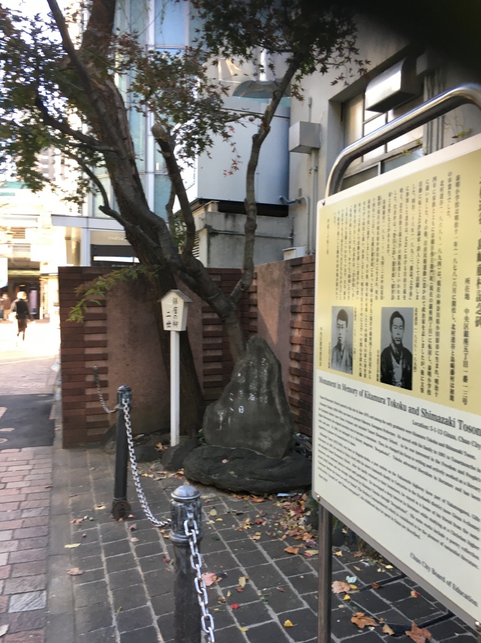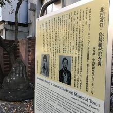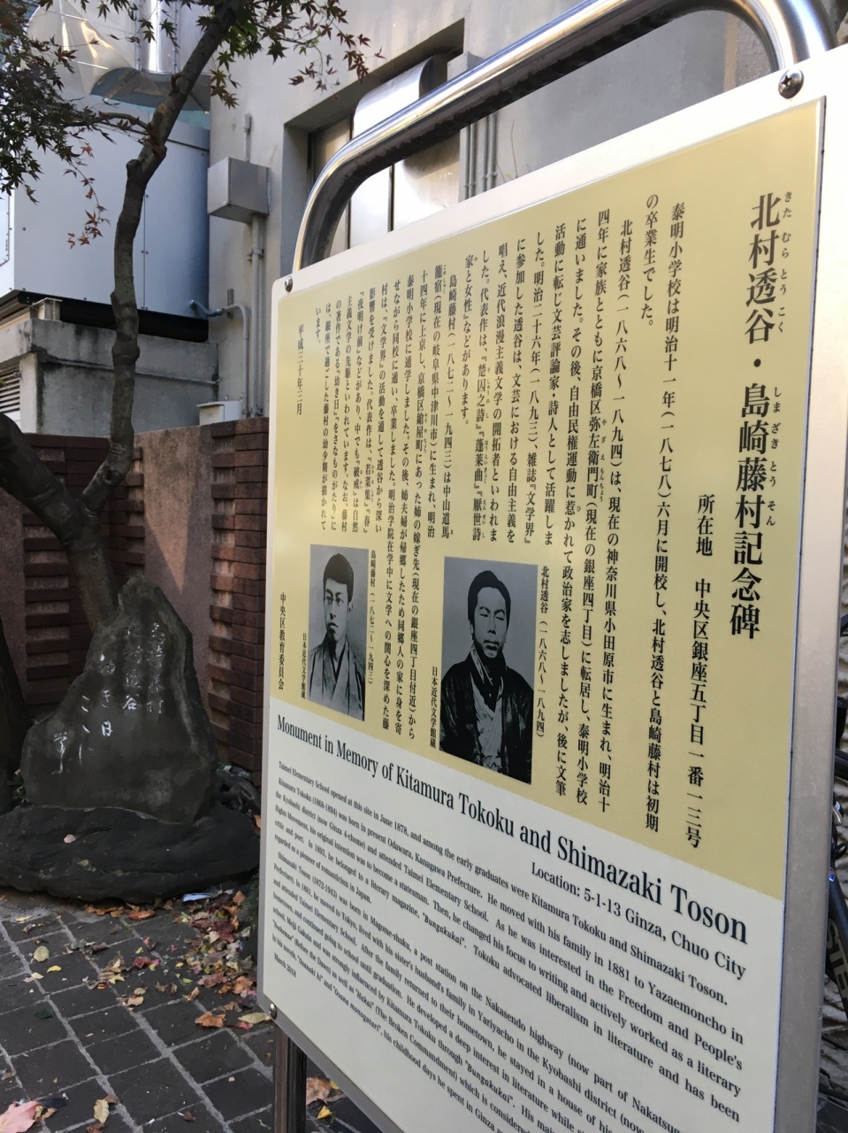 泰明小学校の正門の左側にあり、二人の写真の掲載もあり文学青年ぽい顔立ちでした。二人は小学校の初期の卒業生とのことで、包丁型の石碑には二人のこおが白い文字でありました。説明看板にも二人のことが詳しく記載してあります。