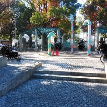 恐竜のモニュメントが置かれていて、遊具に混ざって特徴的な設備。木々も適度に植栽されており、憩いの場所としても最適だと感じた。