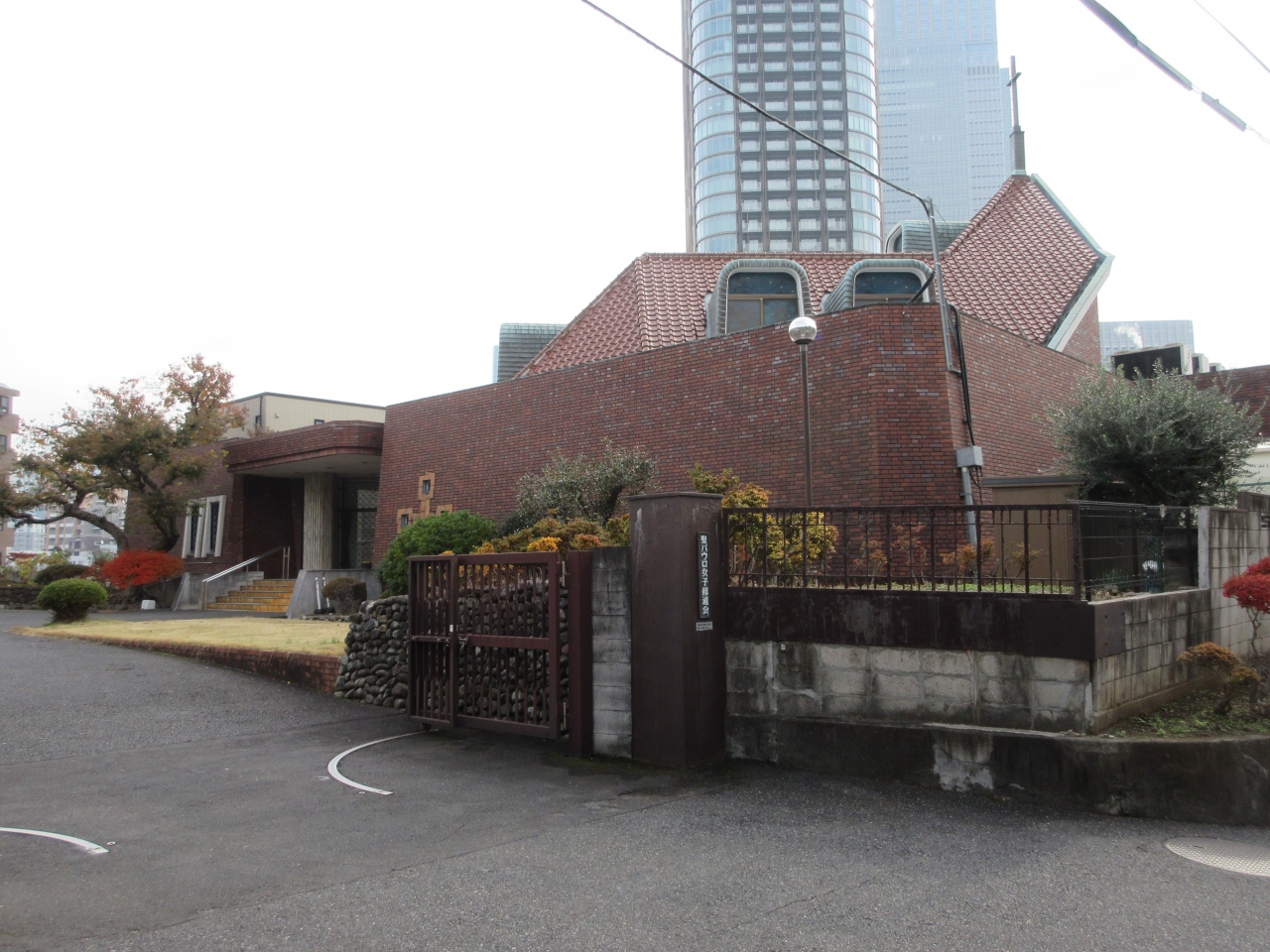 乃木坂駅出口1から乃木神社の前を通り乃木坂を下ったマンションの脇の道路入口に聖パウロ女子修道会の掲示板があります。その坂道を上がっていくと右手にレンガ造りの聖堂が見えます。白い十字架がレンガ色の瓦屋根に建っていて、窓のステンドグラスが遠くから見えました。訪れた日曜日の午前、乃木坂沿いの掲示板とその周りを見に来ていた高齢のシスターがゆっくりゆっくり坂を上り、敷地内の建物に入っていくのを見かけました。急な坂道でシスターたちはこの坂を上り下りするのは大変だろうなと思いました。