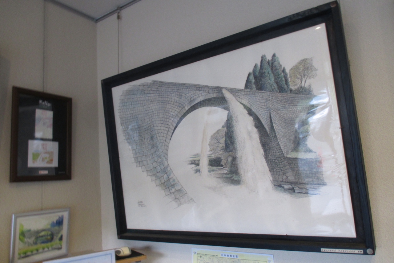 通潤橋史料館は、レストラン「いしばし」の左隣にありました。館内は入ったところは写真などの展示がされていました。その先が、通潤橋の紹介をはじめとする通潤橋史料館の中心で有料となっています。布田保之助や石工たちが通潤橋を架橋するまでの工程や、実物の石管やジオラマなどにより通潤橋の構造も詳しく知ることができるとのことですが、コロナ対応として閉鎖されていました。