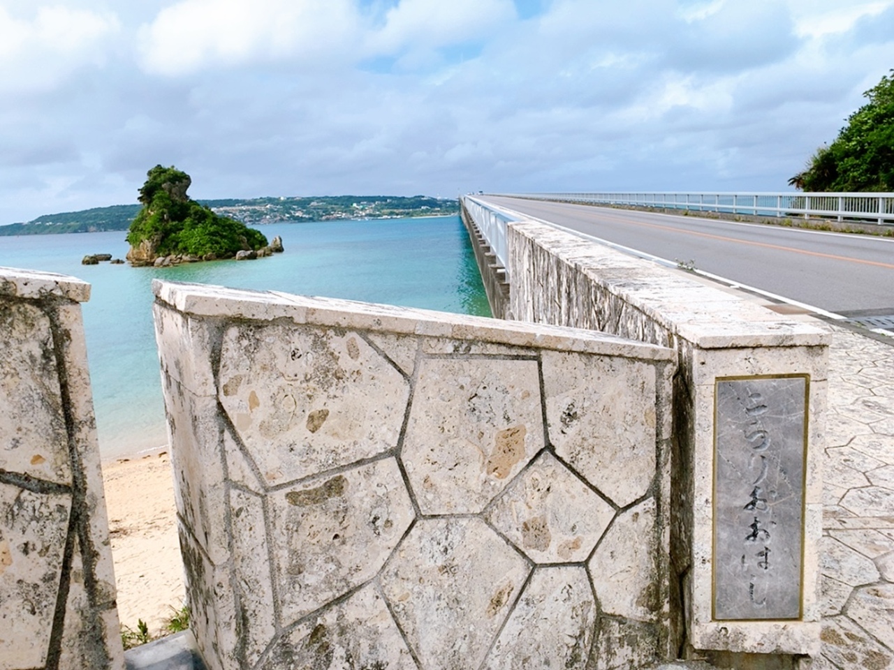 GWに沖縄本島に旅行に行った時にレンタカードライブで訪れました。 古宇利島に行く時に渡る橋で、ここまで行くにはレンタカーが必要です。 橋の上(途中)では車を停車することは出来ませんが、橋の入口にちょっとした駐車スペースがあるので、そちらから橋と青い海を入れたキレイな写真を撮る事が出来ます。
